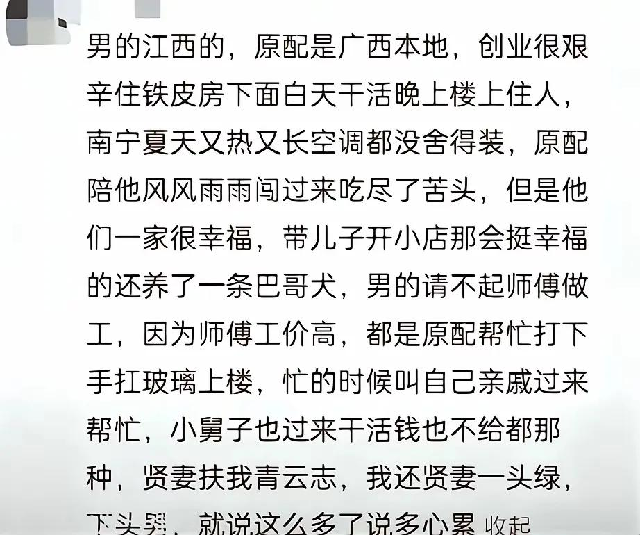 知情者说,出轨男是江西人,妻子是广西本地人。两人刚创业时,吃了不少苦,住在铁皮房,夏天都舍不得装空调。白天干活,晚上就挤在铁皮房里。原配陪他吃了好几年苦,后来攒钱做起门窗生意。本以为好日子来了,没想到丈夫却出轨了。