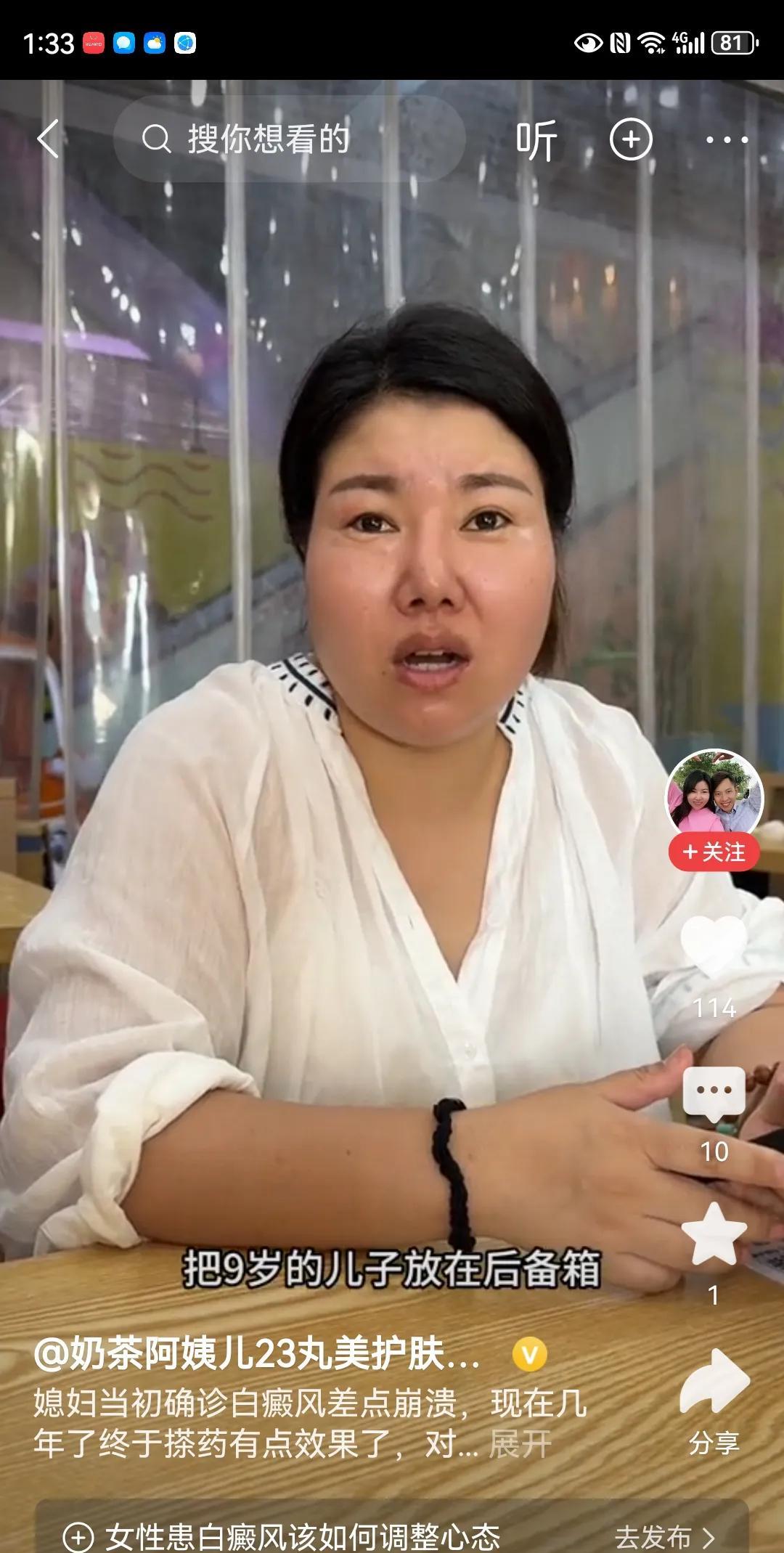 奶总带着大闺女去广州带货,龙哥给配药,收拾,搞后勤。 按惯例,带货之前要提病情,提家庭开支,要撞车。这不,二姐婆婆又一次撞车了,但问题不大,有经验自己解决。奶总的白癜风来几个特写,脖子,眼角,后背,又把衣服撩起来给全网看看。顺便奶总提提,家里老大要毕业开始工作了,老二还得读几年,压力山大,以后还要供小芊羽,必须努力努力再努力多搞钱。另外奶总再吐槽一下,网络上把九岁儿子塞后备箱的事情,谴责有后妈就有后爸,怎么那么心狠,孩子好可怜。 话说,这出门可能太匆忙,叶子妆都没来得及化,就只做了指甲,没化妆不打扮素颜就出门了,确实就普通人一枚,除了个子高,丢人群里也毫不起眼。 有网友提到个新名词:口水癣,说奶总那不是白癜风,是口水癣,真的假的?看了那么多医生都没看明白?再说,若真是口水癣,那爱好是真独特,也真重口味!