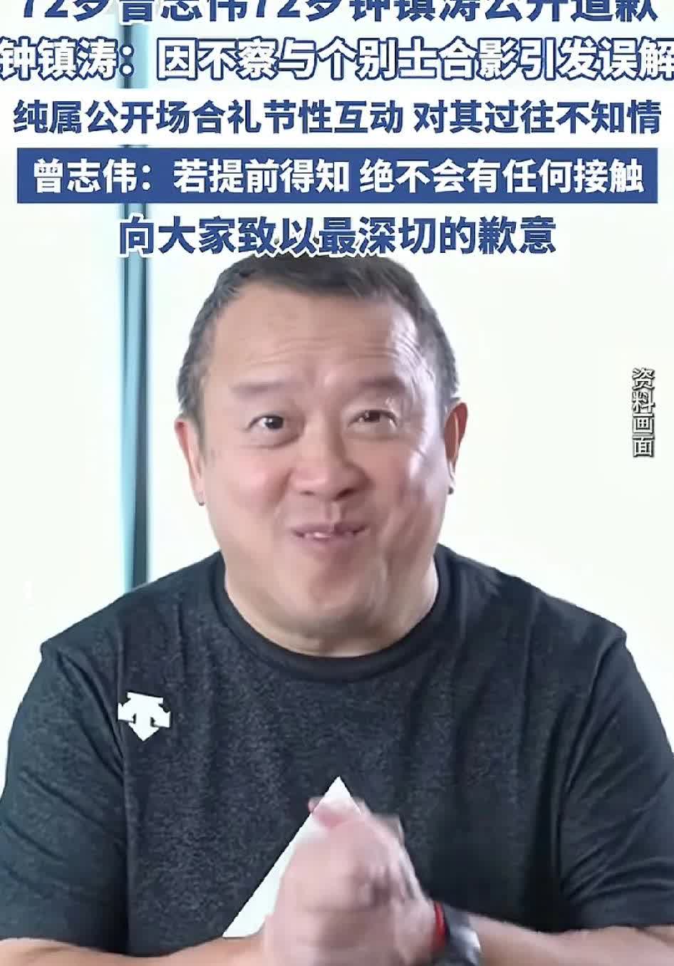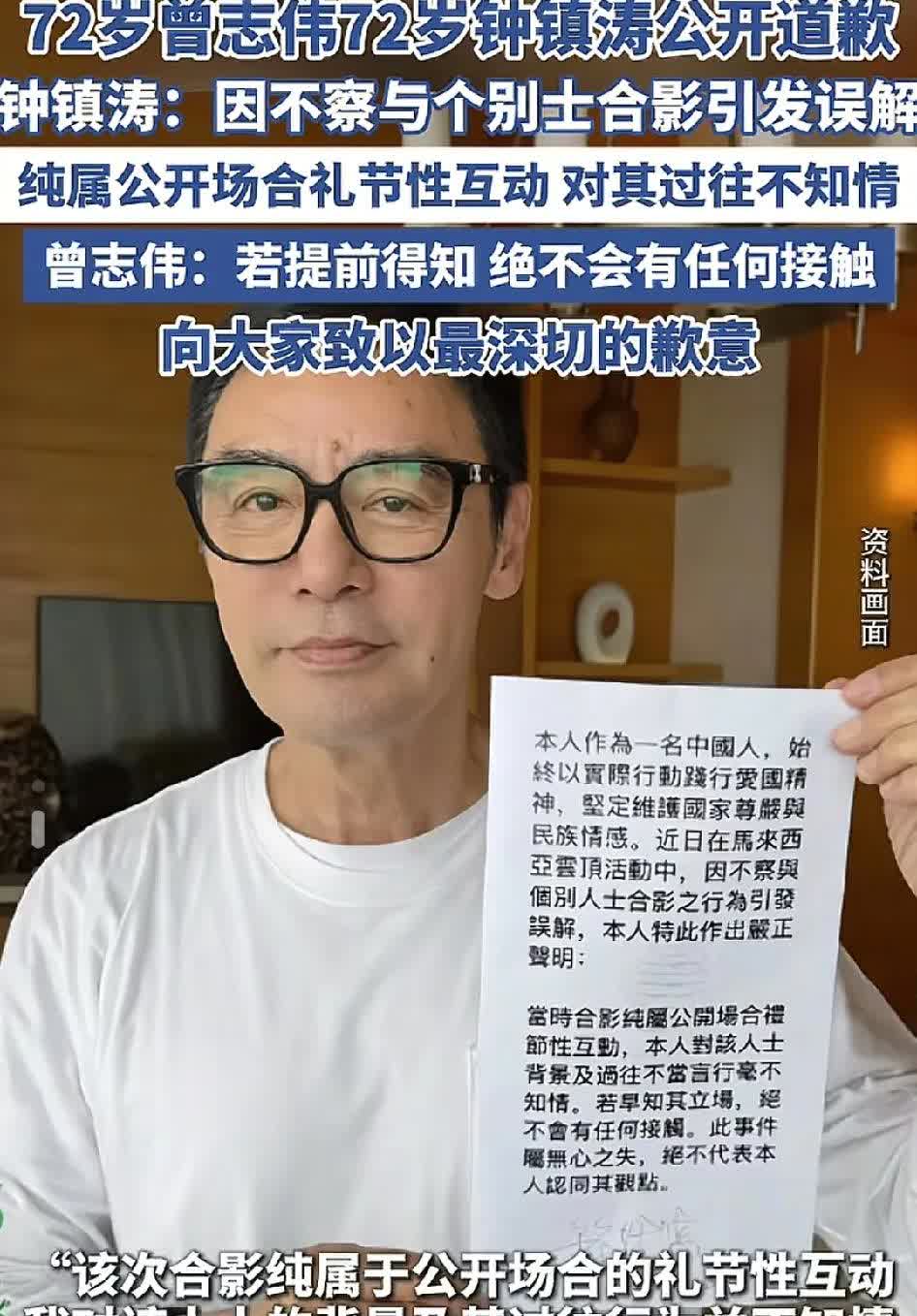 曾志伟咋又公开道歉了? 记得以前有过好几次来的,都啥事来着? 这次公开道歉,又加上了个钟镇涛。 事件起因是在一个公开场合里,跟马来西亚的一个人合影了。 曾志伟表示,若提前得知,绝不会有任何接触,他向大家致以最深切的歉意。 钟镇涛也是一样的说辞,他俩是约好的吧? 小时候看的港片儿,里边儿总有曾志伟。 钟镇涛还挺帅的,他会唱歌,演过啥电影不记得了。 印象最深刻的是,他老婆花光了他的财产。 这怎么老了老了,总惹祸 !