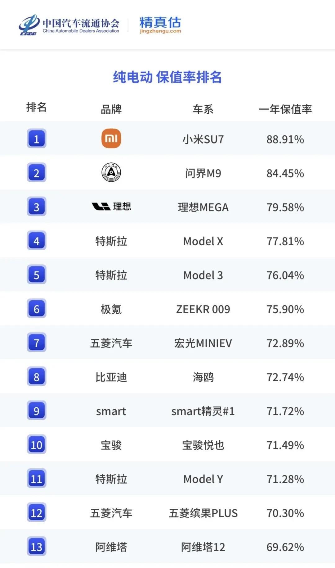 小米SU7打败特斯拉拿了第一,又让雷军装到了。精真估发布的2025年上半年中国汽车保值率研究显示,小米SU7的保值率达88.91%,在所有纯电车型中均高居第一。小米SU7对标的特斯拉modely仅排名11,保值率仅有71.28%。这个表现令雷军喜不自禁,没想到在销量上干过特斯拉后,保值率上也实现了全面碾压。难怪雷军的帖子都压抑不住内心激动,直言特斯拉保值率一直不错,只是这次不如小米。 但客观来说,小米SU7上市还不到一年半,远未达到正常稳定的市场供需,如今排队提车的时间还需要7-8个月,处于严重供不应求的状态。这种时候提保值率意义不大,因为一手市场买不到,二手市场甚至需要加价才能买到,这种情况下的小米汽车保值率应该超过了100%,就是说有120%都不为过。 所以说,小米SU7的保值率必然存在被夸大的成分。真正的保值率第一,应该是华为问界M9的84.45%,该车上市近3年,等车周期在6-8周,是行业正常区间。当然,作为参考,跟小米SU7同月上市的理想mega,其79.58%的保值率更接近小米的真实水平。