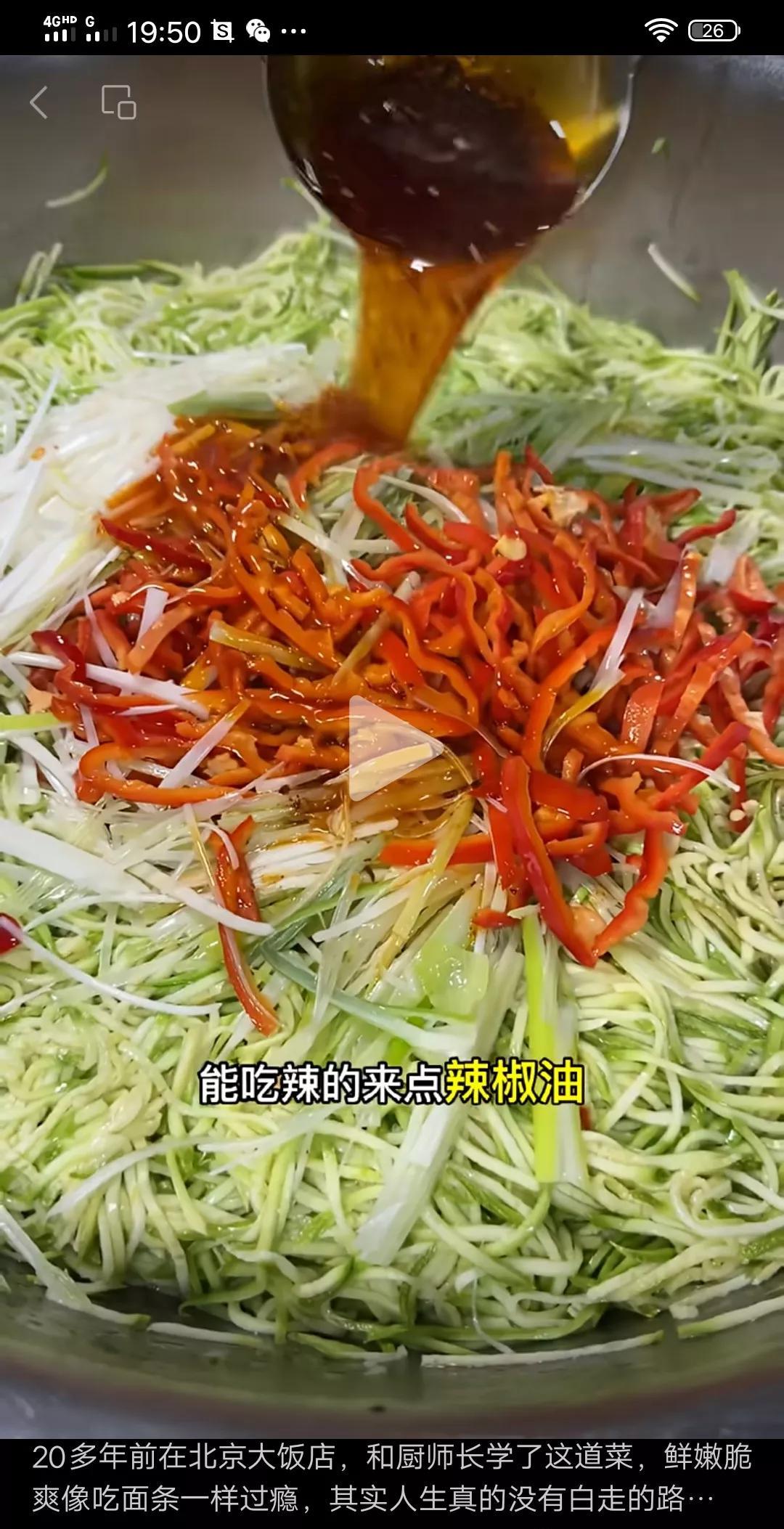 凉拌西葫芦 地里刚摘的西葫芦,去除根部,擦成均匀的丝条,盆中倒入凉白开,30斤菜加300克盐,浸泡10分钟,捞出来沥干水分,放入盆中,加生抽,蚝油,白糖,陈醋,香油,蒜末,红辣丝,葱丝,浇上热油激发香味,能吃辣的来点辣椒油,抓拌均匀即可!