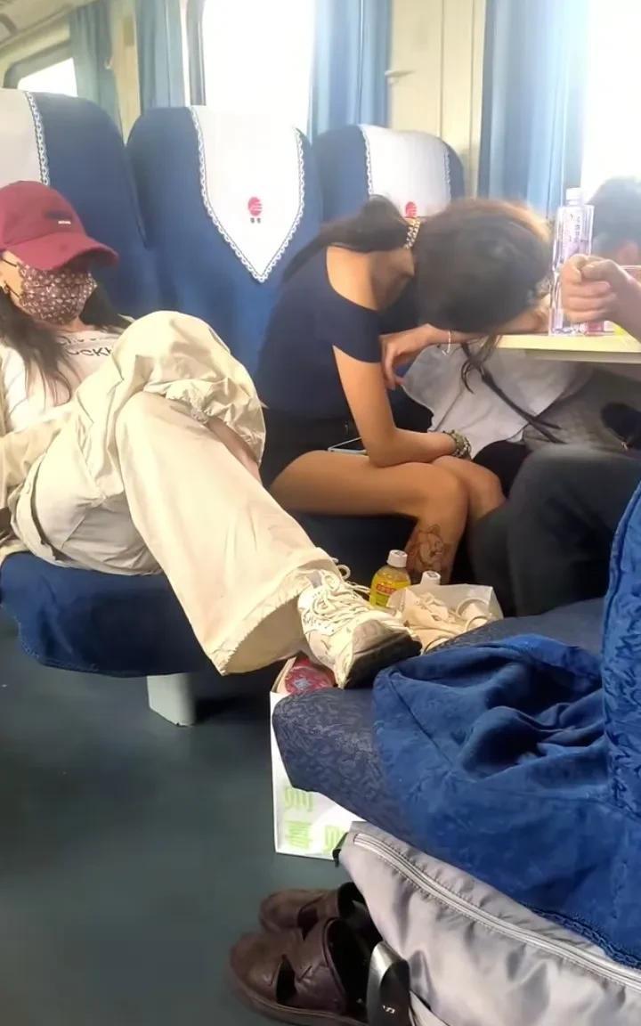 2个大神!一个脱了鞋躺在座位上睡觉,一个脚踩到对面的座椅上玩手机!大夏天的,身上本来就有汗味,大叔还脱鞋让别人闻他的臭脚丫子味!戴口罩的女孩也不文明,鞋那么脏去踩座椅,让别的乘客怎么坐!那位腿上纹着“猫”的女孩还挺文明的,趴在小桌子上老老实实睡觉。火车不是自己家,想干嘛就干嘛!大家一定要文明出行,方便你我他!