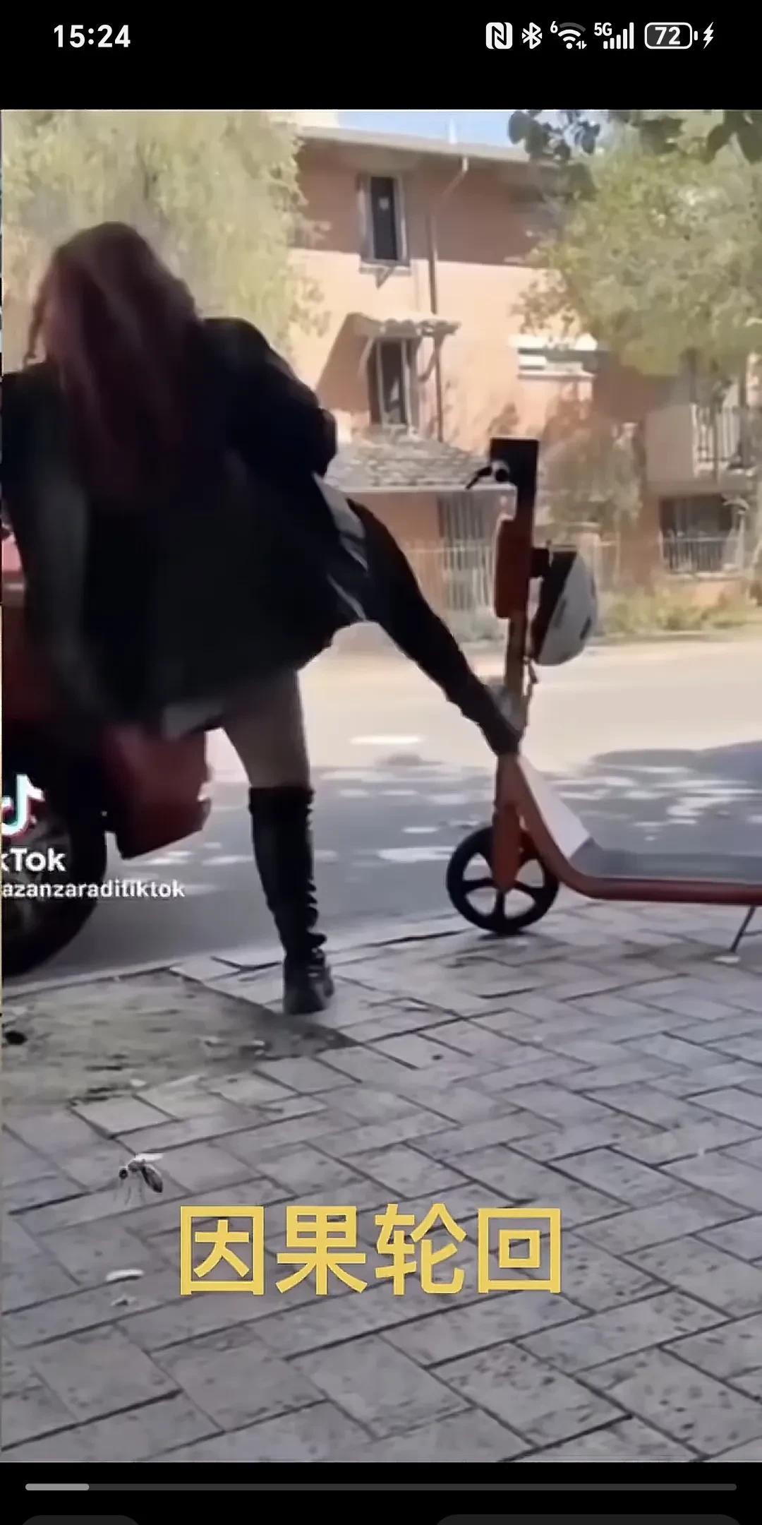 因果轮回~ 女子手中拿着一杯奶茶,把停在那里的电动车用脚踢翻,当她转过头回来的时