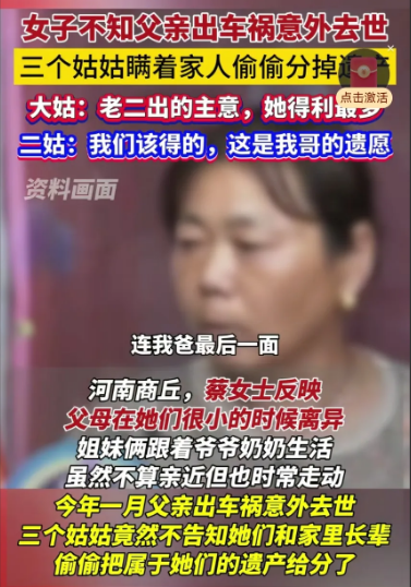 太欺负人了!女子不知父亲去世3个姑姑分掉遗产#,感觉俩姐妹太可怜了。根据新闻报道,这对姐妹很小的时候,父母就离异了,两姐妹就只能在老家跟着爷爷奶奶长大。后来,他们的爸爸不知道有没有再婚,但应该没有其他孩子,就她们俩。姐妹俩因为跟爷爷奶奶长大的,与三个姑姑不说多亲密,但都是正常走动的亲戚关系,一直以为大家是一家人。