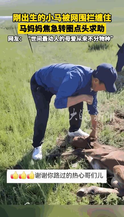 “太有灵性了!”7月21日,内蒙古,男子在草原游玩时,发现有一匹马不停地转圈,还冲自己点头,男子好奇的靠近,看到地上有一匹小马被铁丝网缠住,看样子刚出生没多久,男子这才明白,原来母马是在向自己求救!网友:谢谢你,善良的两脚兽。 内蒙古是许多人向往的地方,那里蓝天白云,有着一望无际的大草原,光是看看就感觉很放松了。在这片草原上,还发生过许多人与动物的感人故事! 这天,男子和朋友在大草原上游玩,草原上生机勃勃,马儿在蓝天下尽情地奔跑。忽然,他发现不远处有一匹马行为怪异。 那匹马远离马群,而且还在不停地转圈圈,男子好奇的走了过去,他发现草地上还躺着匹瘦弱的小马,母马见男子靠近,于是点了点头,似乎在说:救救地上的孩子吧。 男子仔细观察,发现小马是被铁丝网缠住了,于是他小心翼翼的拨开铁丝,然后一把揪住小马提了起来,帮助它摆脱了困难。 随后,小马就蹦蹦跳跳的和大马一起离开了。 网友看后表示,男子真是好样的,是一个有爱心的人,值得我们学习! 大家对于这件事是怎么看? 信息来源:《7月21日,内蒙古。刚出生的小马被网围栏缠住,马妈妈焦急转圈点头求助》新华社