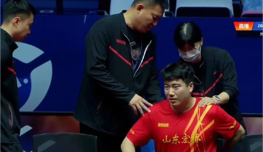坏消息:梁靖崑受伤了! 担任山东魏桥第三盘打单的梁靖崑上场刚打了五个球突然跟裁