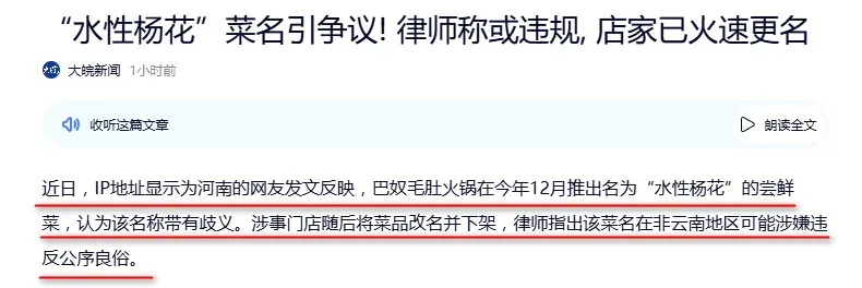 因为这词确实也有歧义。所以也有律师表示,该菜名在非云南地区可能涉嫌违反公序良俗。