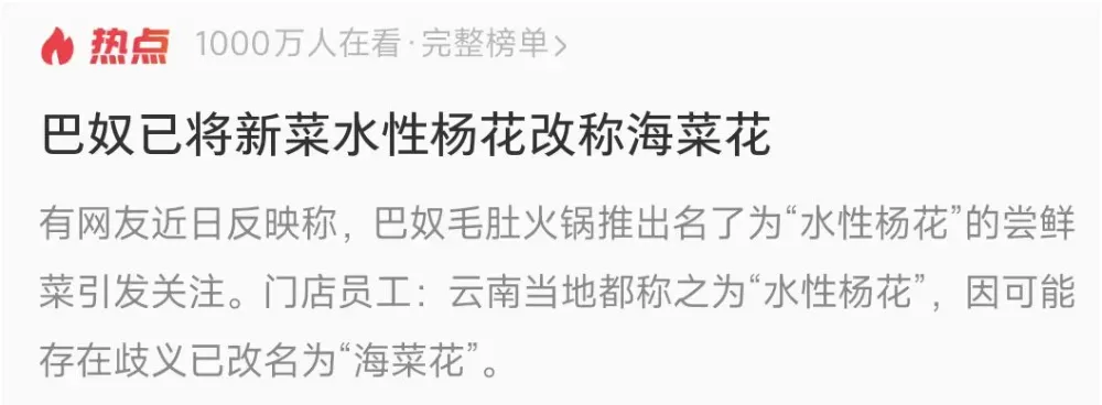 巴奴火锅这回面对舆情,倒是反应迅速,已经火急火燎地改名——“海花菜”了。