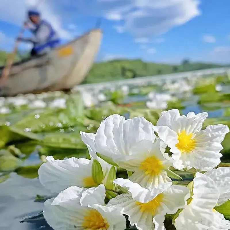 洁白的花瓣,明黄的花蕊,当阳光洒向湖面,湖风拂过山涧,大片大片漂浮在湖面上的海菜花随着湖波轻轻荡漾,就像湖面的精灵一样,美得不像话!