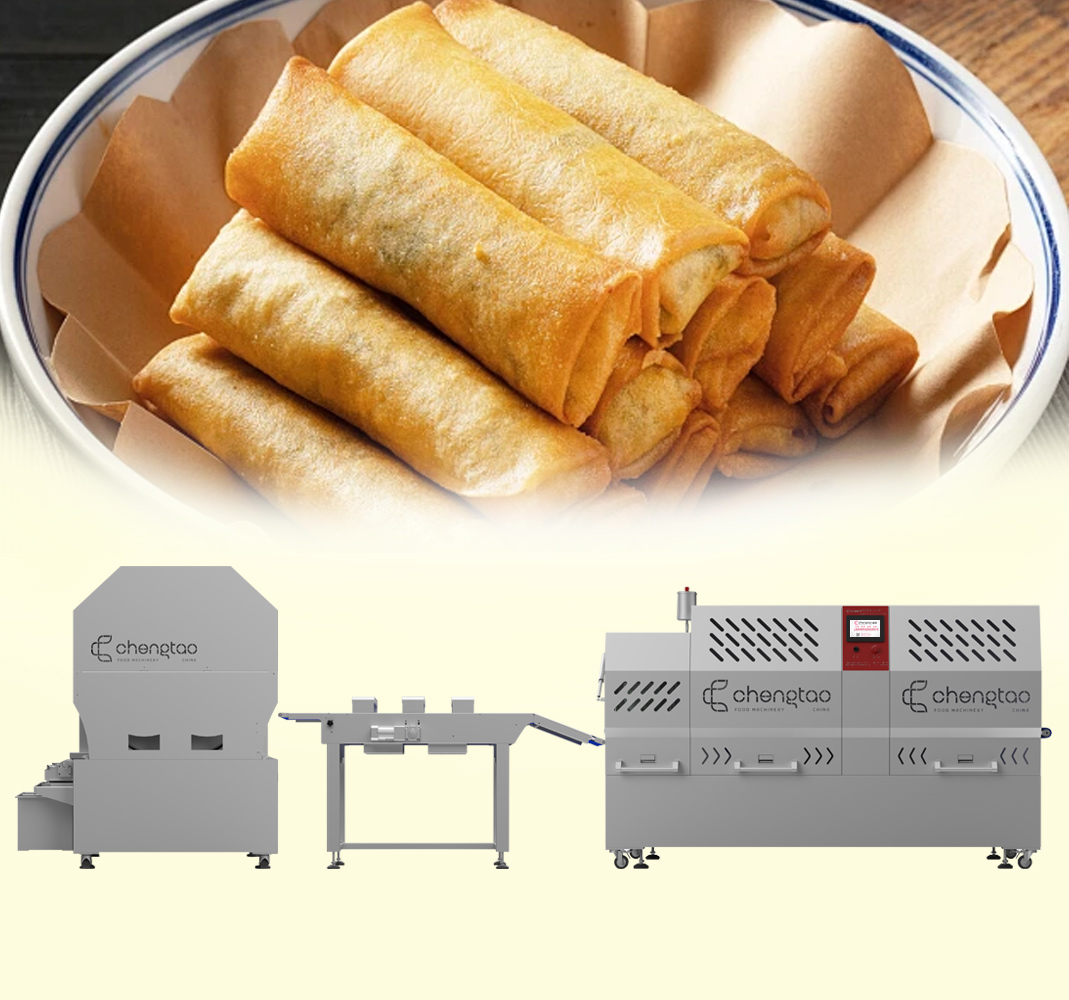 从生产工艺角度分析,春卷制造涉及制皮、冷却、注馅、卷制、成型等多个连续工序,传统模式下各环节依赖人工衔接,不只效率受限,更难以保证皮厚一致性、馅料定量准确性及卷制松紧度的工艺稳定性。这种生产方式在应对外贸代加工订单、连锁餐饮配送等规模化场景时,暴露出明显的瓶颈。