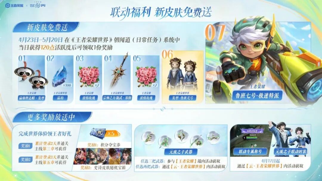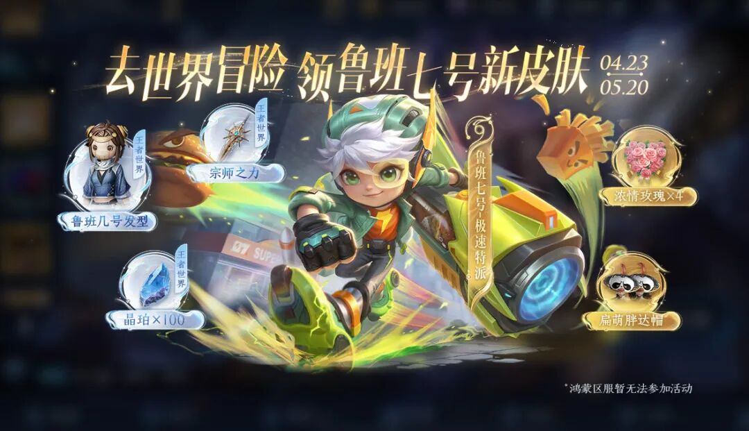 鲁班七号的这款新皮肤,可以通过活动获取。活动将于4月23日开启。但是,需要去王者荣耀世界里面完成活跃度任务朝闻道,且需要完成满活跃。奖励一共分为七个,要在活动期间内完成满活跃7天,才能在第七天拿到鲁班七号的这款新皮肤【极速特派】。另外,右下角特别注明了鸿蒙区服暂无法参加活动。可能是因为移动端暂时还没开放的缘故。
