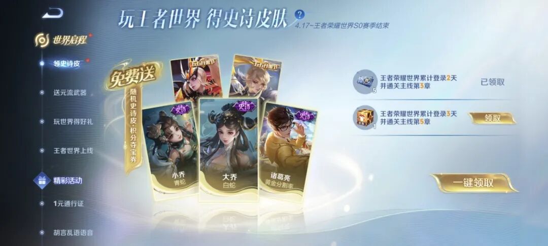 可以看得出来,小王还是很希望大家去尝试一下“王世杰”这款游戏的,毕竟是打磨了这么久才上线的,基于王者荣耀IP衍生的首款游戏。但是,活动奖励,有点抠抠搜搜的。先前是送了随机的史诗皮肤宝箱,里面塞入了古早时期的五款直售史诗,好在我白蛇还没有,于是就开出了白蛇。然后是现在,送了一款勇者品质的新皮肤,但是要刷满一周的日活才能拿到。但同时,又设置了一个月后会加入碎片商店的设定。不如直接做一款世界联动皮肤,只能去世界中获取,王者荣耀中无法获取,或许更能刺激到玩家们去试玩王者荣耀世界。