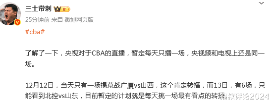 北京时间12月10日,根据媒体人三土带刺的发文报道,央视对于CBA的直播,暂定每天只播一场,央视频和电视上还是同一场。1