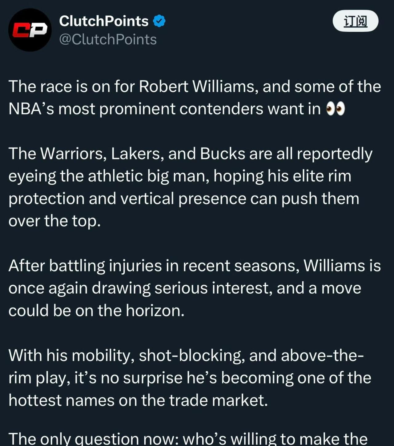 罗伯特威廉姆斯正在引发关注! 罗伯特威廉姆斯的竞争正在悄然展开,NBA的一些季后赛球队当下正在观望! 据报道,勇士、湖人以及雄鹿都在密切关注着这位运动型大中锋,期望借助他那精英级别的护框能力推动球队更进一步! 罗威在近几个赛季始终饱受伤病的困扰,不过并不影响部分球队对他表现出浓厚的兴趣。罗威具备出色的运动能力和精英级别的防守能力,所以尽管有些“脆皮”,但仍有不少球队对他有兴趣。 有兴趣和达成交易是两回事,那么问题就来了,所以哪支球队会率先和开拓者商讨罗威的交易呢?#NBA# #湖人# #金州勇士# #雄鹿# #NBA热点#