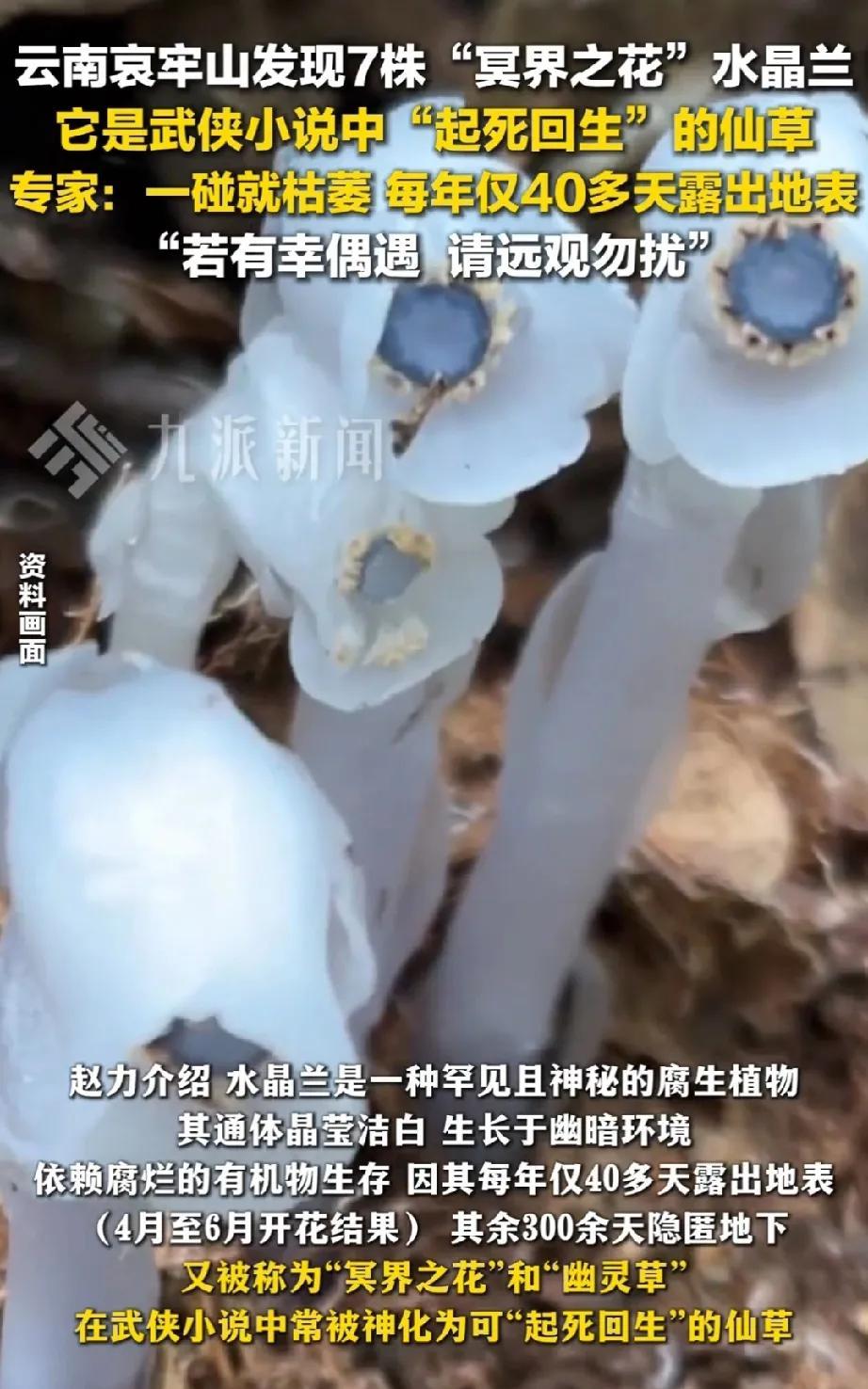 四川昆虫学家赵力,近日在哀牢山意外发现7株冥界之花,这一发现引发了网友的热议与好奇。 冥界之花到底是什么花呢? 传说中的四大冥界之花,分别为彼岸花(象征生死轮回);曼陀罗(代表恐怖诱惑);罂粟花(警示毒品危害);水晶兰(被视作死亡之花)。 此次,赵力在哀牢山发现的7株冥界之花正是水晶兰。这种花极为罕见,花期仅有40多天,完全绽放之时非常美丽,宛如水晶一般,通体晶莹剔透。 该花在国内外均属于濒危珍稀物种,见到时千万不要采摘。 大自然的美无所不在,能够亲眼见到这种水晶兰,实在是幸运至极。