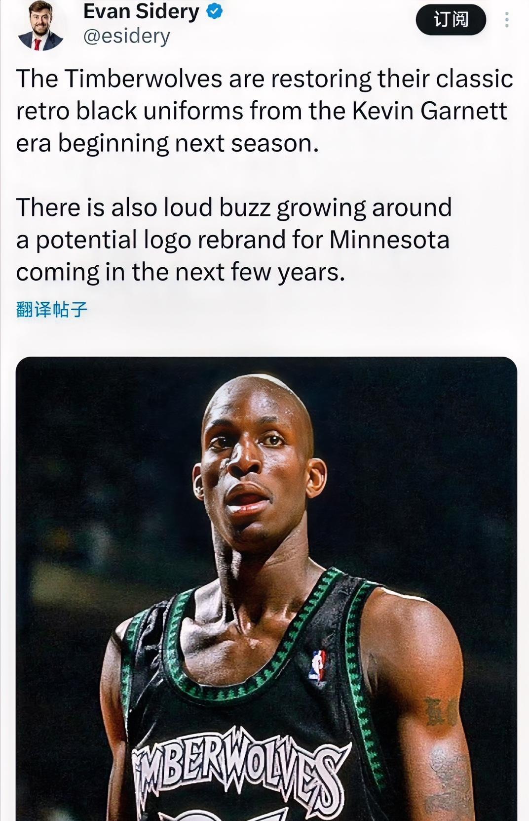 森林狼重启“狼王”时期复古球衣! 据NBA记者Evan Sidery透露:从下个赛季开始,森林狼将恢复2000年代加内特时期的经典复古黑色球衣。配色以黑色为主体,搭配森林狼标志性的蓝绿色为点缀。 围绕明尼苏达未来几年潜在标志品牌的重塑,此举在当地引发了不小的轰动!