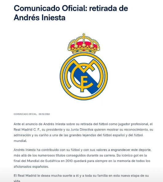 当伊涅斯塔选择退役的时候,皇家马德里在官方账号上表达了对伊涅斯塔的尊重:伊涅斯塔宣布退出职业球员行列,皇家马德里俱乐部、其主席和董事会向西班牙和世界上最伟大的足球运动员表达了敬意、钦佩和关爱。