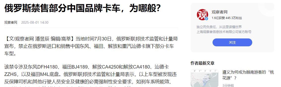 一边把中国卡车当市场主力,一边突然对东风、福田等品牌亮红牌 —— 俄罗斯这波禁售操作,到底藏着啥心思? 要知道,中国卡车占了俄进口量的九成,汕德卡、解放这些牌子上半年就卖了近八千辆,可官方嘴上说 "安全不达标",暗地里却早把回收税涨了又涨,堵死了中亚转口的路。 这哪是挑车的错,更像在给中国车企递话:想接着赚,得按我的规矩来。 俄罗斯突然给中国几款卡车下了禁令 —— 东风、福田、解放这些眼熟的牌子,有些车型不让卖了。 官方说是安全不达标,刹车、噪音这些没过关,可这事往深了看,不光是 “车不合格” 那么简单。 其实俄罗斯早就在给中国车企 “设坎儿” 了,他们从去年开始就没少动心思:先是把进口车的回收税往上提,一年涨一次,要一直涨到 2030 年。 后来又堵死了从中亚转口的空子,以前从吉尔吉斯斯坦绕个弯能少缴税,现在不行了,转口的量从 30% 直接掉到 2%。 这次拿安全说事儿禁售,更像是接着施压:想在这儿好好做生意,得按我的规矩来。 啥规矩?说白了就是想让中国车企在俄罗斯建厂,俄工贸部部长早说了,光靠收税不够,得 “找个平衡点”。 意思就是,不能光把现成的车运过来赚钱,得把生产线搬过去,带带本地的就业和产业。 之前汕德卡一款车就因为噪音、防撞这些问题被停售,逼着企业改设计、召回,其实也是这个路数。 这背后,是中国卡车在俄罗斯卖得太火了,今年上半年,俄罗斯新进口的卡车里,十个有九个是中国来的。 就说汕德卡,卖了快 4000 辆,解放、东风加起来也有几千辆,合着占了当地近三成市场。 要知道 2022 年以前,咱们在那儿的份额还不到 10%,西方车厂一走,中国卡车就趁机占了不少地方。 这会不会影响中俄关系?应该不至于,普京今年还说欢迎中国车企来合作呢,毕竟俄罗斯缺靠谱的卡车,中国车企也需要市场,双方是互相需要的。 这种禁售更像生意上的 “讨价还价”—— 俄罗斯想借着安全标准、税收政策,逼中国企业多在本地扎根;咱们的车企也得适应人家的规则,该改的改,该建的建。 其实这也正常,哪个国家不护着自家产业? 俄罗斯汽车业这几年被西方制裁折腾得够呛,想借中国车企的技术和投资补补短板,但又怕被 “卡脖子”,所以一边开门迎客,一边设点门槛。 中国车企也得明白,在人家地盘上赚钱,光靠便宜不行,得把安全标准、售后服务这些细节做扎实,甚至把工厂建在当地,才能站得稳。 说到底,这就是中俄做生意时的小摩擦,大方向上,两国互相需要,不会因为几款卡车禁售伤了和气。 但具体到生意上,俄罗斯要的是 “一起赚” 而不是 “一家独赚”,中国车企得学着在人家的规则里把日子过好。 毕竟,能在俄罗斯市场扎下根的,从来不光靠便宜,还得懂规矩、会变通。