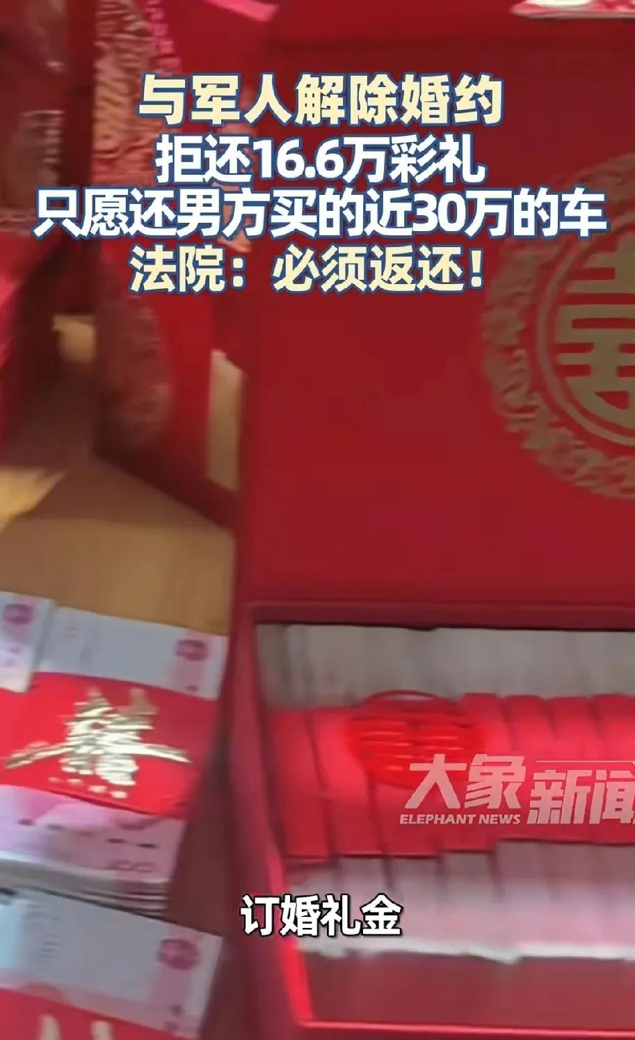 江苏宿迁,女子和现役军人恋爱订婚后,男方给她16.6万彩礼,并买了一辆30万的车给女子使用。还没等到结婚,女子觉得这样的生活不是她想要的婚姻,提出悔婚,退还了车辆,但拒不返还16.6万彩礼。男子为此告上法庭,法院这样判! 8月1日,据大象新闻报道,女子和现役军人订婚后,又提出悔婚,还不愿退还彩礼,双方为此对簿公堂。 女子小王到了谈婚论嫁的年纪,但她这个“乖乖女”一直没有找到心仪的对象,小王父母有点着急,就委托媒人帮忙物色女婿。 父母的要求很简单,只想找个老实本分,对女儿好,能踏踏实实过日子的就行。 没多久,媒人就给小王介绍了一个“兵哥哥”王甲。 军人这个职业,有责任有担当,小王对王甲的第一印象也非常不错,两人发展为恋爱关系。 军恋不像普通的男女朋友,见一面不容易,但王甲每天都通过电话对小王嘘寒问暖,分享他每天的工作和生活。 小王感受到王甲给予的幸福感,两人于2021年9月正式订婚。 为了表达对小王的爱意,王甲不仅按照当地习俗给了小王家16.6万彩礼,还购买了一辆价值近30万的车给小王代步,方便小王生活。 随着新鲜感的消失,小王对这段感情慢慢萌生了退意。 别的情侣都是成双入对,生病有男友陪伴,出去逛街也能手牵手,只有她形单影只,这份婚姻仿佛就是她人生的枷锁。 还没等到结婚,小王就提出悔婚,单方面解除了这段婚姻,这辆车也还给王甲。 但王甲不同意,订婚已经告知了所有的亲朋好友,现在突然被悔婚,这太打脸不说,而且白白损失了16.6万多彩礼。 小王也有自己的委屈,她用最好的青春陪伴了王甲这几年,这些钱难道不应该作为对她的补偿吗? 王甲和小王协商退还彩礼无果后,他一纸诉状把小王一家告上法庭,要求退还16.6万彩礼。 一般类似的案件,法院都会根据双方的实际情况,酌情要求女方返还部分彩礼。 该案例中,法院会如何酌情判决呢? 一、王甲和小王未登记结婚且未共同生活,符合法定返还彩礼的条件。 《最高人民法院关于适用〈中华人民共和国民法典〉婚姻家庭编的解释(一)》第5条规定:当事人请求返还按照习俗给付的彩礼的,若双方未办理结婚登记手续,人民法院应当支持。 王甲与小王已订婚但未办理结婚登记,且未实际共同生活,符合未登记结婚、未共同生活的彩礼返还条件。 这16.6万元属于以结婚为目的的彩礼,而非普通赠与,法院肯定会判决返还,至于返还多少,需要法官具体酌情判定。 对于小王主张的青春补偿,并没有法律依据,彩礼的法律属性是附条件赠与,婚约解除后,条件未成就,女方继续占有构成不当得利,必须返还。 二、王甲作为军人,其权益受法律特殊保护。 《军人地位和权益保障法》第4条规定:全体公民应当依法维护军人合法权益。 王甲作为现役军人,职业特殊性导致其婚恋时间受限、经济负担较重。 本案中,16.6万元彩礼已对军人家庭造成沉重负担,若不予返还可能影响军心稳定,危害国防利益。 三、小王的家庭成员有共同返还的责任。 引最高人民法院《关于审理涉彩礼纠纷案件适用法律若干问题的规定》第3条:接受彩礼的家庭成员可作为共同被告承担责任。 法院审理查明,彩礼实际由小王父母接收,法院因此将小王及其父母列为共同被告,追究小王父母的连带责任。 既尊重了彩礼交付通常涉及家庭共有财产的现实,也避免了女方通过转移财产逃避责任。 法院审理认为,王甲和小王没有办理结婚登记手续,也没有共同生活,提出分手后,小王应当返还彩礼。 最终,法院依法判决,小王和其父母共同返还王甲16.6万彩礼,经过法院督促,小王一家已将彩礼全部返还。 #头号创作者激励计划#