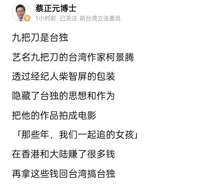 蔡正元博士举报了这个九把刀,我们对这些文化“台独”的惩戒力度还是太小了。我们不能