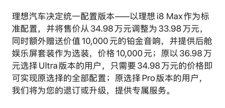 简单地说就是,之前的Pro Max Ultra三个版本统一成一个版本,售价33.98万元,也就是说,买想买i8的用户,都能选配冰箱彩电大沙发了,具体信息可以看图2。