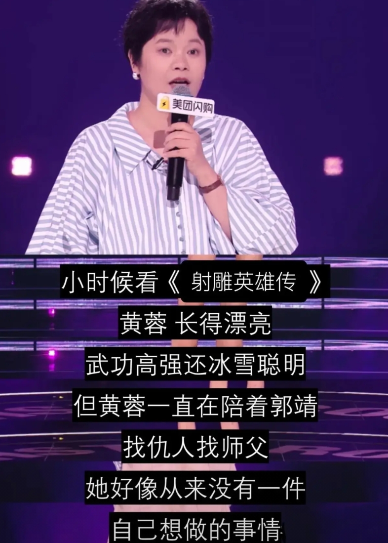 一个不找对象不结婚的脱口秀演员,质疑黄蓉恋爱脑,陪着郭靖是没有自我。乖乖,人家乐意的事儿,怎么就没有自我了,“汝非鱼安知鱼之乐”?