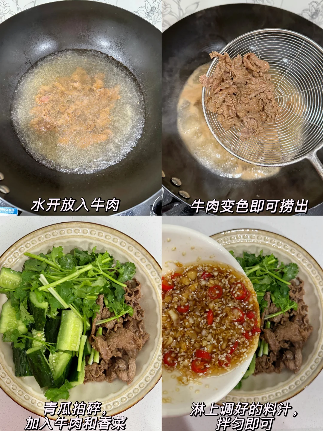4️⃣水开倒入牛肉煮到变色即可捞出,加入青瓜和香菜,倒入调好的料汁,拌匀即可👌