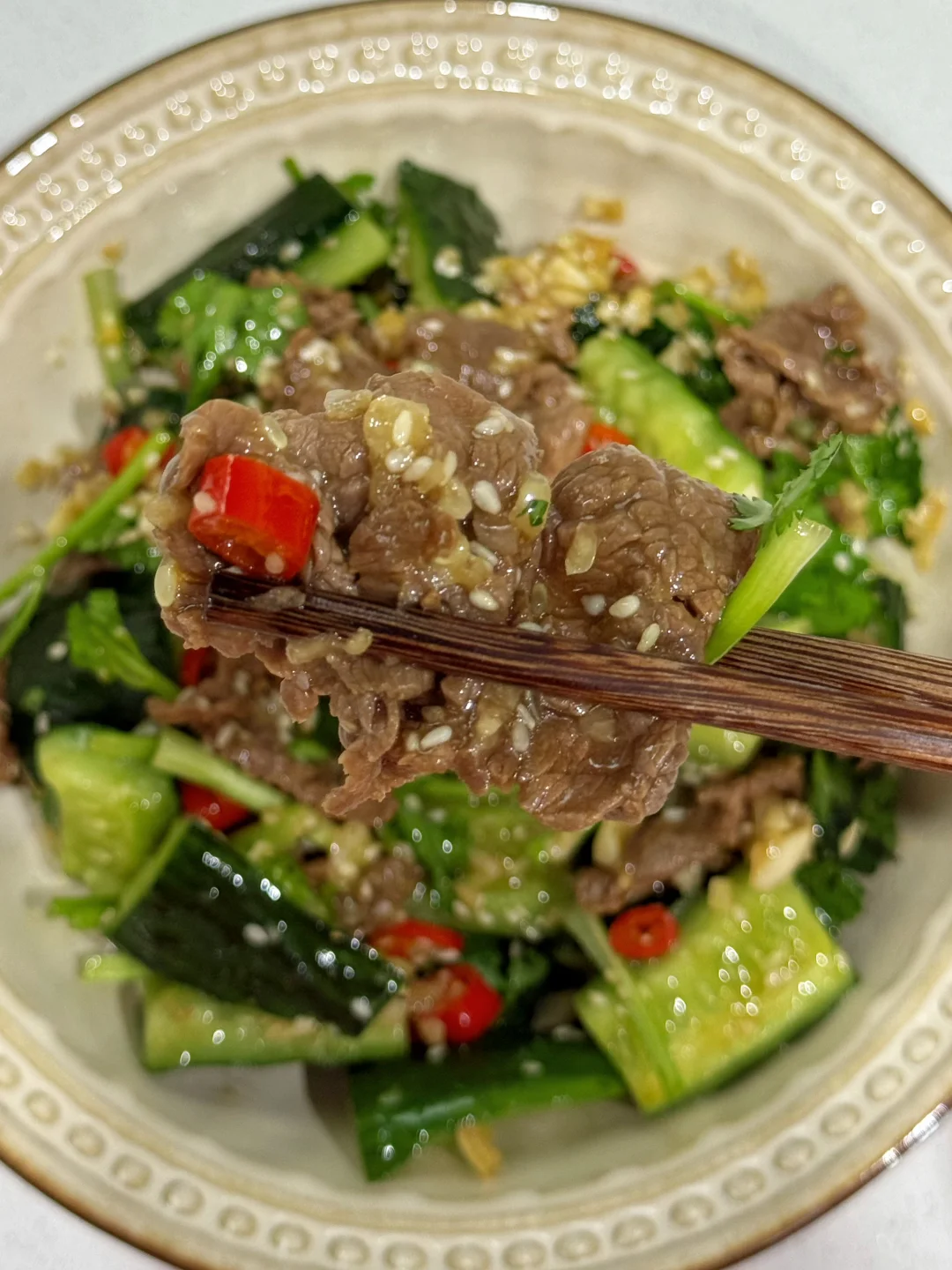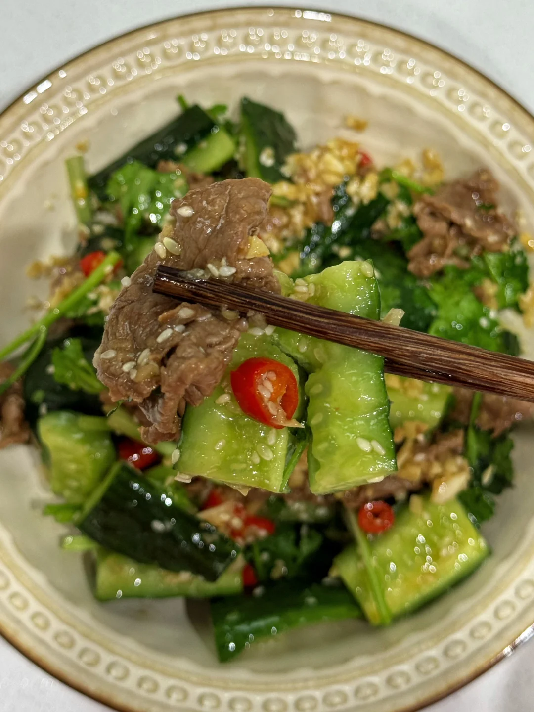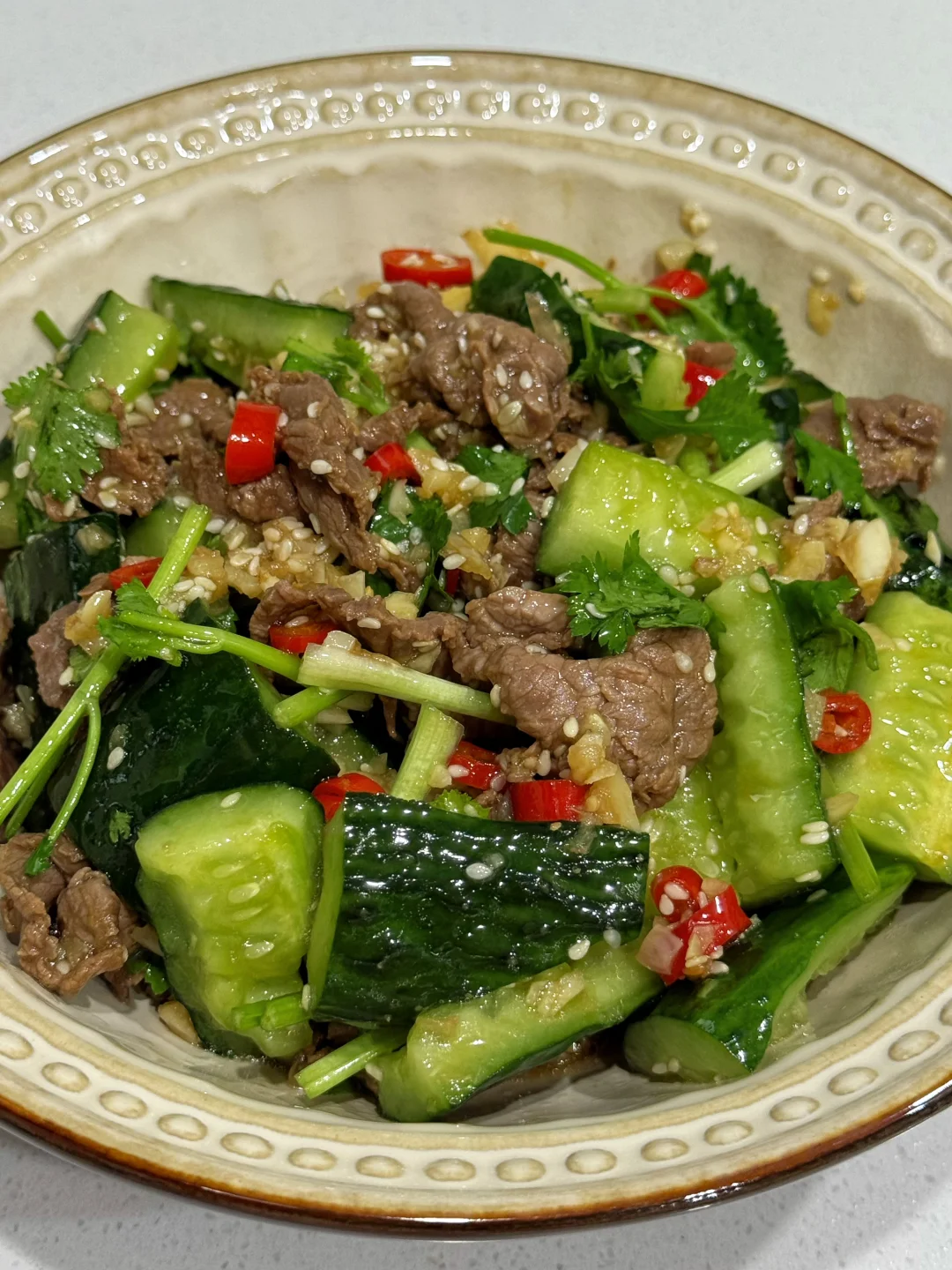🍳【食材】:牛肉、青瓜、小米椒、蒜末、香菜、白芝麻