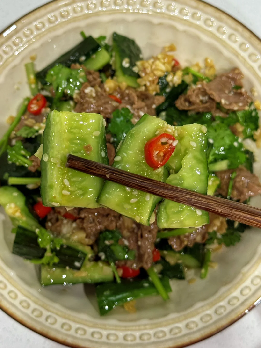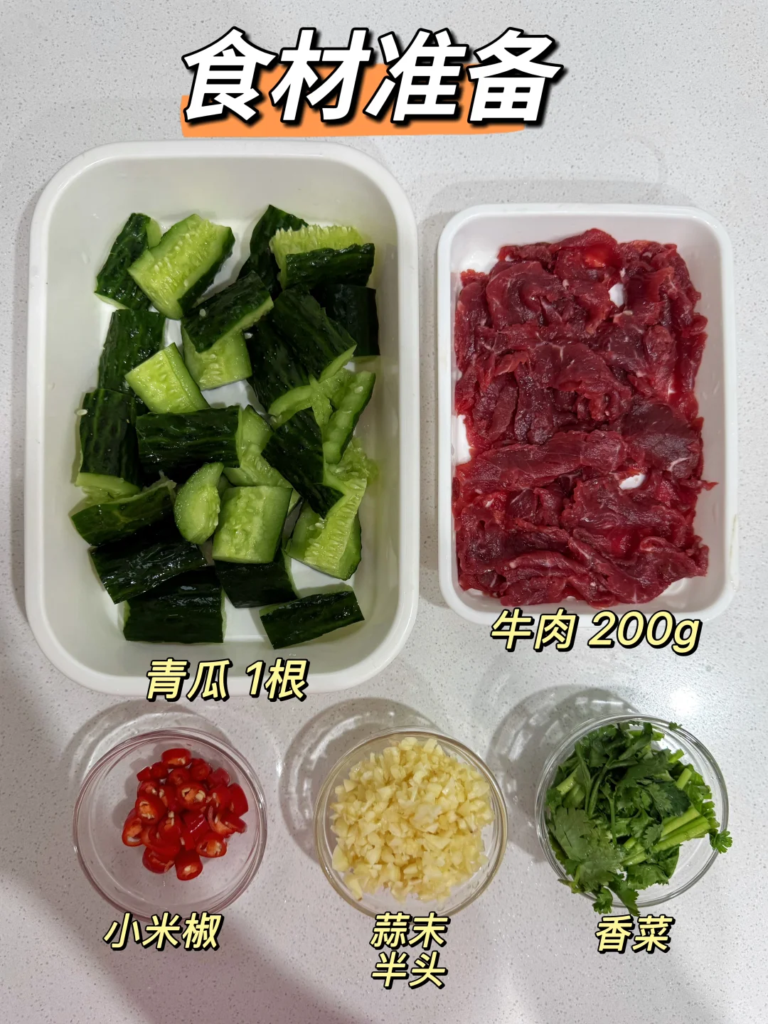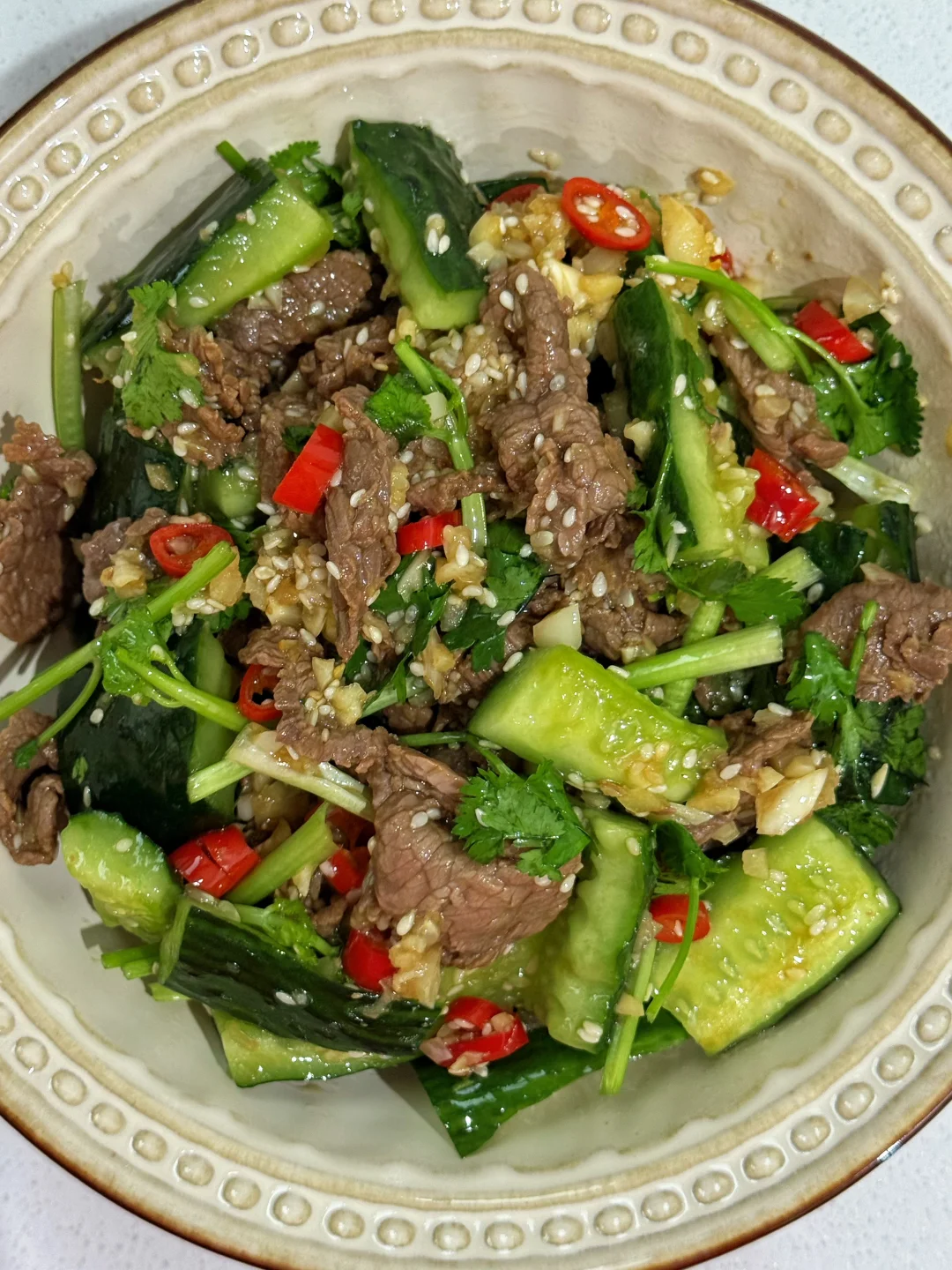 🍳【食材】:牛肉、青瓜、小米椒、蒜末、香菜、白芝麻