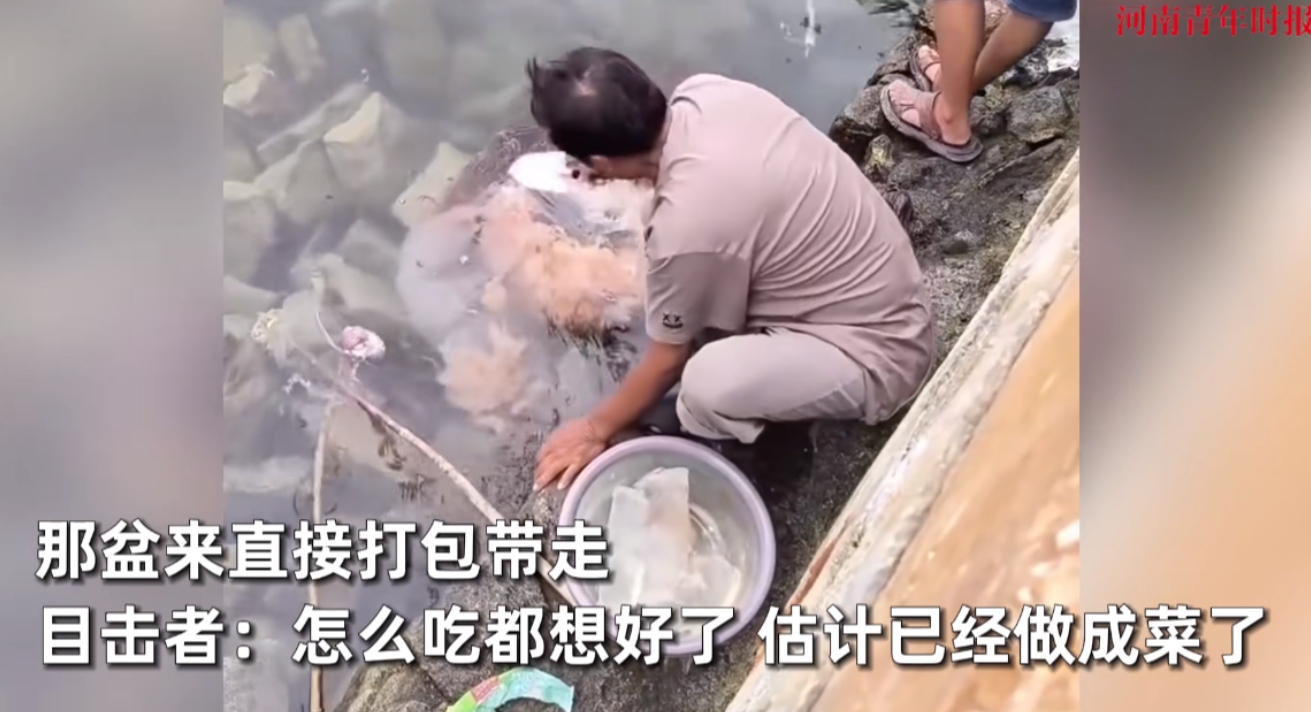 信息来源:《游客海边偶遇巨型海蜇!当地人用铁棍当场分解打包带走:估计已经做成菜了》烟台广播电视台