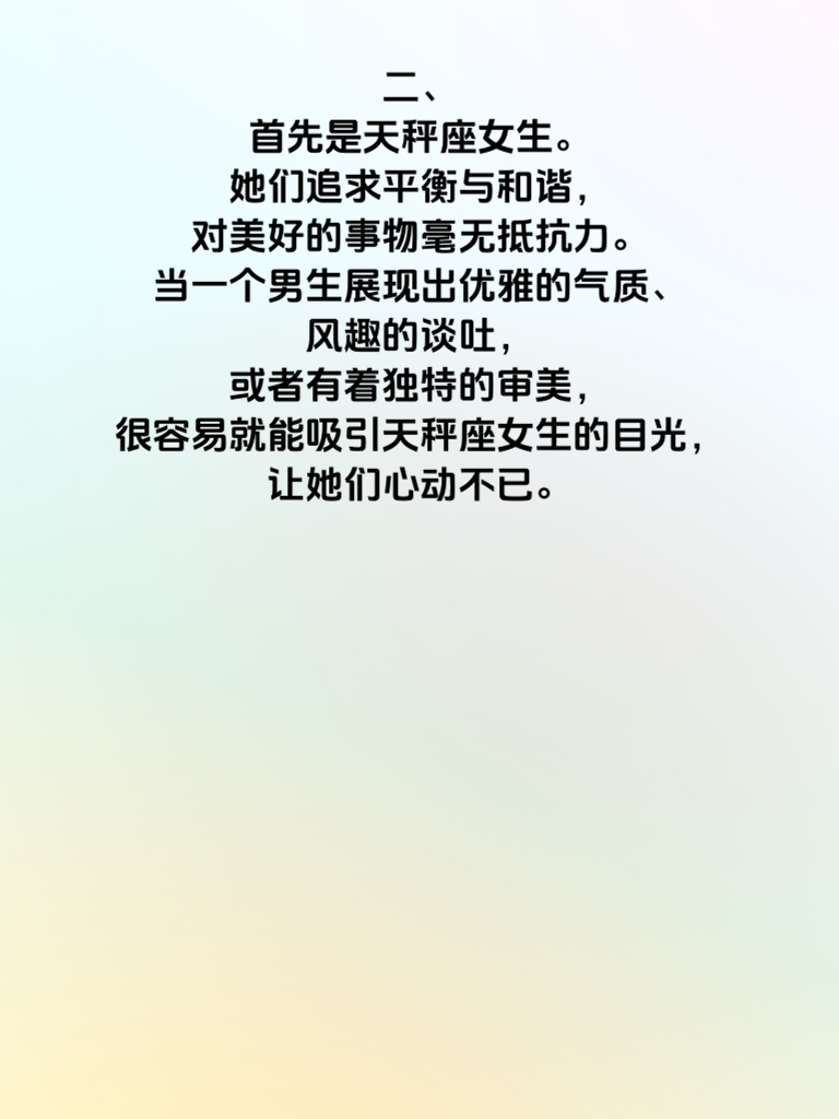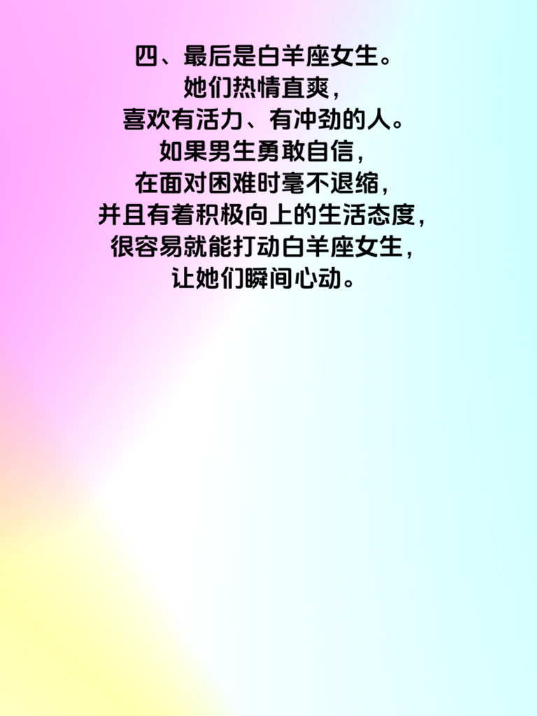一、在爱情的世界里,很多女生都渴望遇到那个能让自己心动的人。其实,有些星座女相对更容易心动哦。今天就来聊聊【倒追攻略】中,这3个最易心动的星座女。 二、首先是天秤座女生。她们追求平衡与和谐,对美好的事物毫无抵抗力。当一个男生展现出优雅的气质、风趣的谈吐,或者有着独特的审美,很容易就能吸引天秤座女生的目光,让她们心动不已。 三、接着是双鱼座女生。她们情感细腻,内心充满浪漫幻想。一个有着温柔眼神、懂得倾听、能和她们一起编织浪漫梦境的男生,会迅速走进双鱼座女生的心,激起她们内心的涟漪。 四、最后是白羊座女生。她们热情直爽,喜欢有活力、有冲劲的人。如果男生勇敢自信,在面对困难时毫不退缩,并且有着积极向上的生活态度,很容易就能打动白羊座女生,让她们瞬间心动。 五、所以呀,男生们如果想追求这三个星座的女生,不妨从她们容易心动的点入手,展现自己的魅力,说不定就能收获美好的爱情啦。