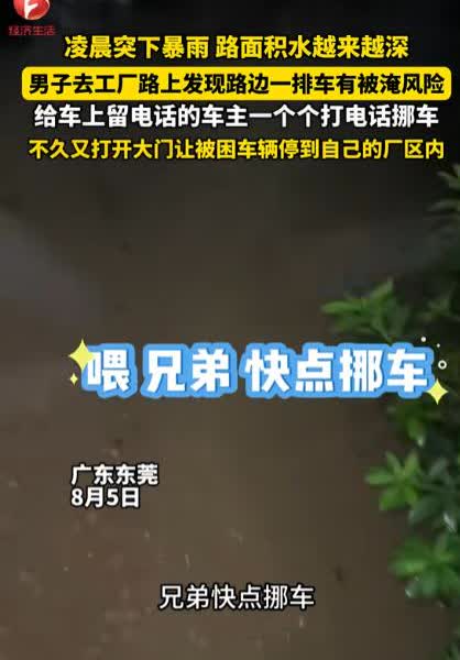 “活该你发财!”广东东莞,凌晨突然下起了大暴雨,男子赶紧前往自己的工厂,安排防洪工作,快到工厂时,却发现路边十几台车已经被水淹到了轮胎! 8月5日凌晨,广东东莞黄江镇的天空,像被撕开了口子,大雨密不透风,落在地面瞬间汇成急流,街灯的光被雨幕切割得模糊不清。短短一小时,积水没过了小腿。 黄先生(化名)是一个厂的老板,他见雨下的额越来越大,积水也越来越深,于是就不放心去厂子里面瞅一眼。 可就在行驶到低洼路段时,他猛然一脚刹车,他看到十几辆私家车齐刷刷停在路边,水正一点点漫进车轮,如果不在第一时间内将车开走的话再过十几分钟,发动机极可能被泡,轻则损失数万,重则直接报废。 随后黄先生下车了,不顾自己的裤腿是否被水浸透,摸着车窗,借助手机的微光,查看车子上留的紧急电话,一个一个打了过去。 但是等到车主们都过来的时候,就算是把车开走,周围也没有什么安全的地方可以停车,这时他们又陷入了沉思。 黄先生想了想,就和大家说到自己有一个工厂,那边地势还稍微高一些,不介意的话就和他走,停到他的厂子里面。 就这样,在倾盆大雨中,一支“救车车队”缓缓移动,他打开工厂大门,车灯一辆接一辆打进厂区,终于停在了高出地面的安全场地。 等所有车安顿好,几名车主拿出红包,想要表达谢意,黄先生连连摆手,一一婉拒,有人悄声说:“至少收个意思吧,不然过意不去。” 他只是笑笑:“车没事就好,大家心里安稳,比什么都值钱。”甚至还讲到,他自己做了好事之后自己浑身舒服得很。 这个视频很快的在网上火了起来,不少网友留言调侃说黄老板的厂子活该发财,这并不是一句随意的赞美,而是发自肺腑的认可。 在危急时刻能伸手相助靠的,也是同样的底气,像黄先生这样不顾自己的安危还去帮助他人的现在真是很少见,希望我们每个人都可以做到和黄先生一样。