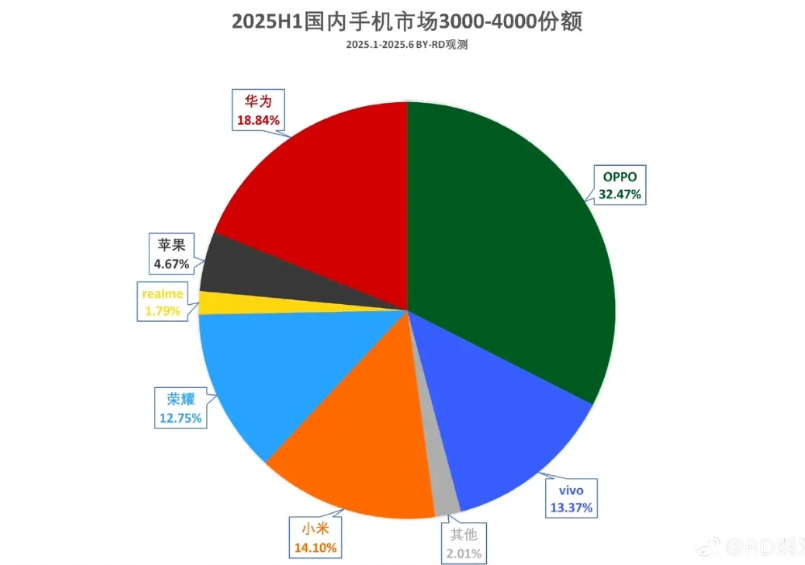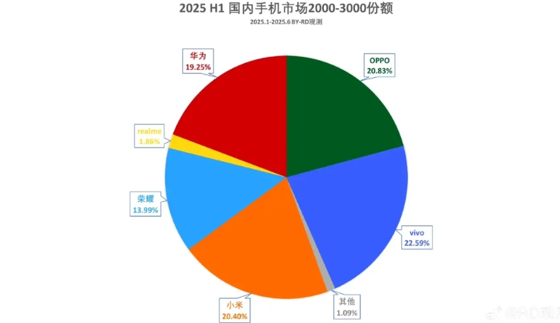 有人统计了今年1月到6月各厂商各价位段的手机销量,大家可以参考下。 可以看出,在1000以下,小米大幅度领先。 在1000-2000区间,vivo和荣耀领先。 在2000-3000区间,国产四家竞争激烈。 在3000-4000区间,OPPO大幅度领先。 在4000-5000区间,华为大幅度领先。 在6000以上,苹果绝对领先,华为紧随其后,两家几乎包圆了。 数据来源见图,仅供参考。
