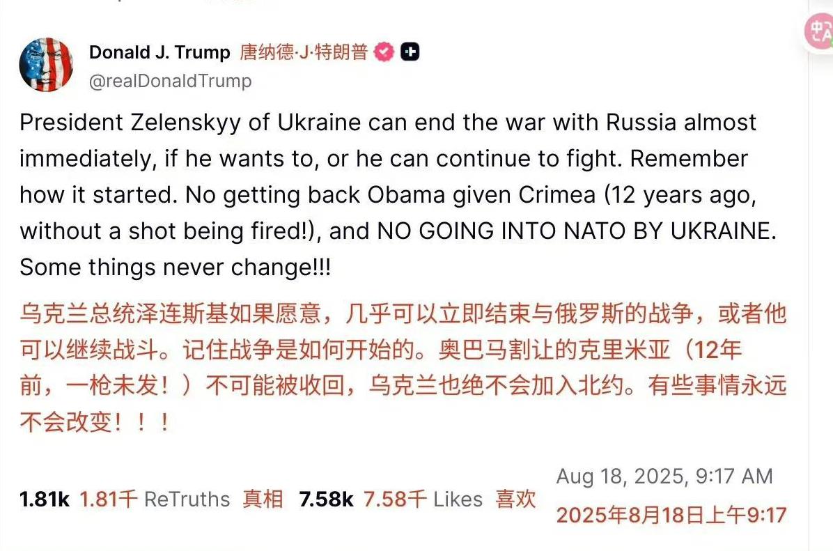 乌克兰被出卖的干干净净!8月18日,特朗普发文,奥巴马割让的克里米亚不可能收回,乌克兰也绝不会加入北约,有些事情永远不可能改变!!! 小评:特朗普一段话把西方国家推崇的丛林法则演绎的淋漓尽致,这种法则被西方社会定义为基于规则的国际秩序。在这样吃人的国际规则和秩序下,小国可以选边站,但不要一边倒,更不能去挑衅另一个大国,那样只能沦为大国的棋子和玩物。最后挨打的是自己,被出卖、被割韭菜的也是自己。 特朗普的话也再次证明,盟友就是用来出卖和割韭菜的。西方社会永远是不值得去信任的,谁相信它们,谁倒霉!这句话要送给一些跳梁小丑国家,比如立陶宛、菲律宾、捷克。也要送给台湾省内的那些“台独”分子,挟洋谋独就是饮鸩止渴,最终是死路一条!