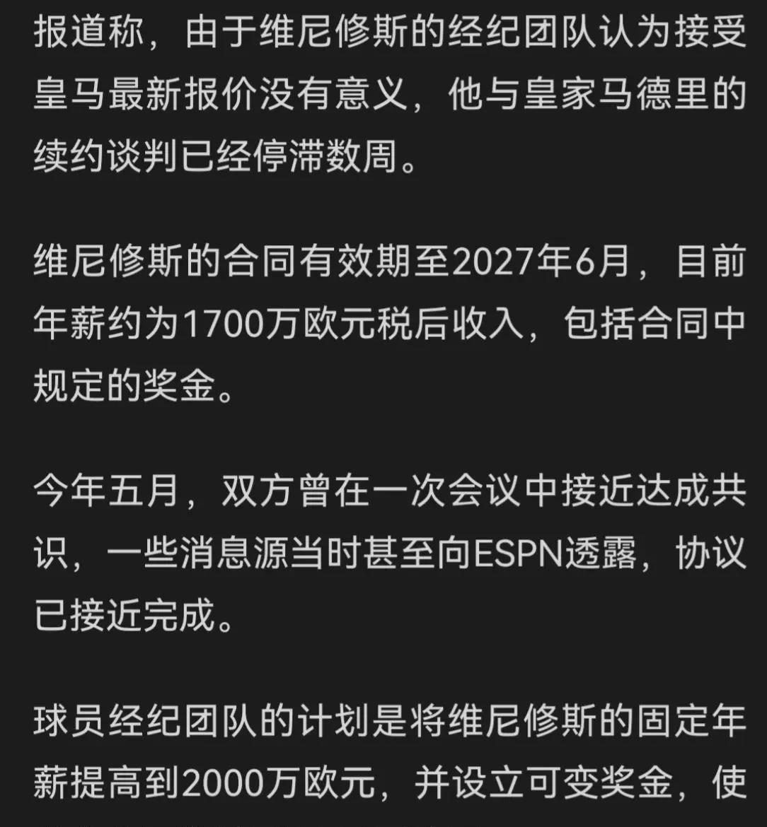 修斯与皇马续约谈判弄僵。他想把自己的年薪提到3000万欧,被皇马高层拒绝#皇马 #维尼修斯 #足球 #足球的魅力