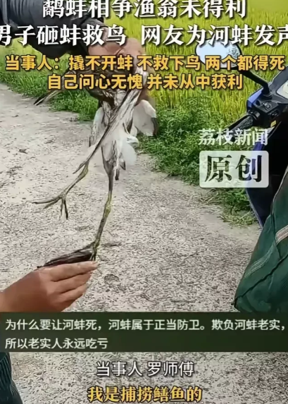 还有网友说,这位村民既然救白鸟,就应该一起救,不能为了救白鸟,把河蚌打死了,这样做太残忍了。