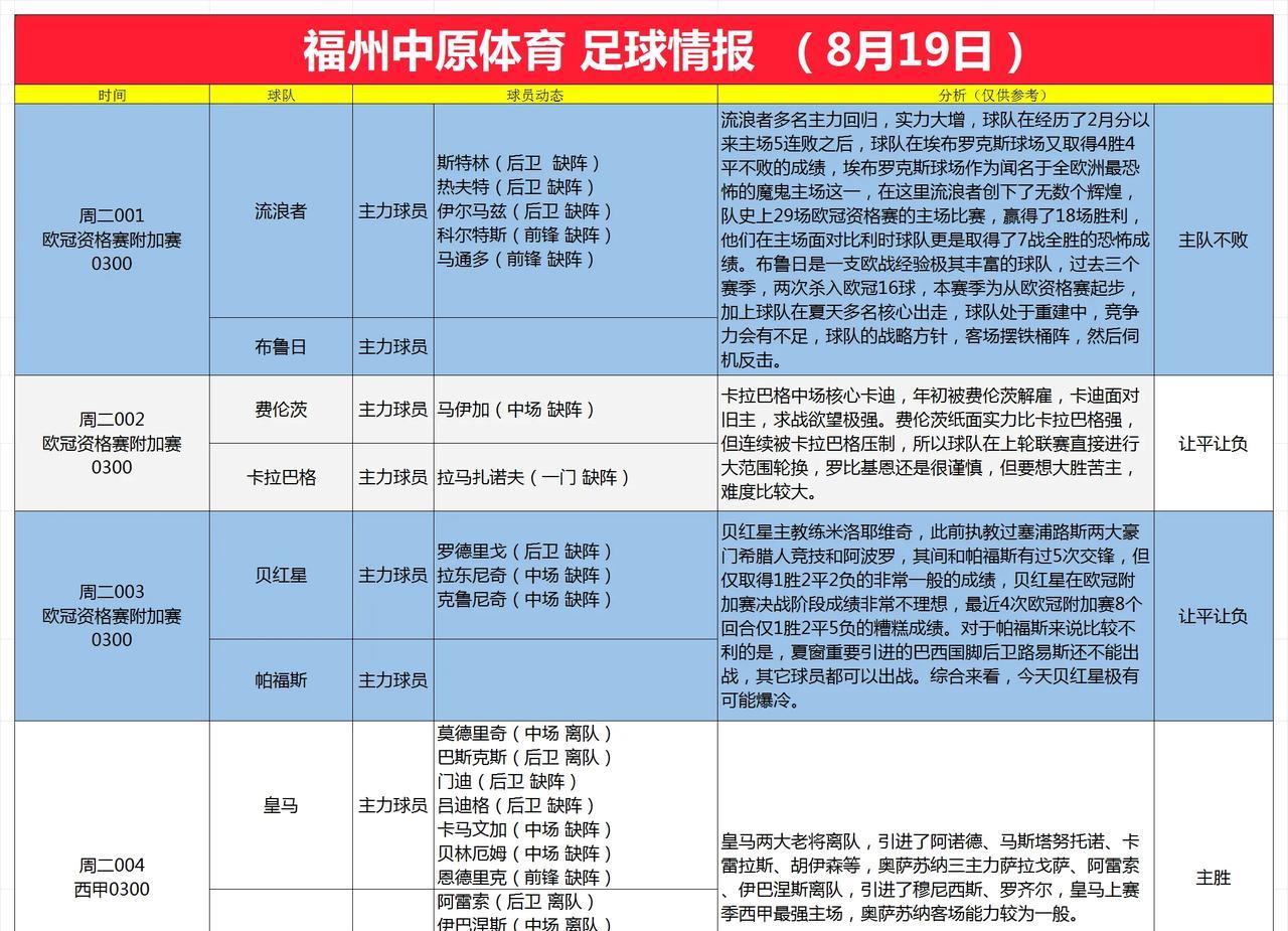 8月19日 足球情报 晋级欧冠正赛最关键一轮,流浪者主场不败,卡拉巴格延续压制费伦茨,贝红星正名自己,皇马开门红。