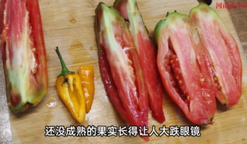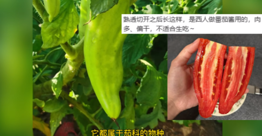 可没想到等成熟结果了之后,番茄的外观却让她大吃一惊,这些番茄看起来一个个粗壮不已,而且都是长条状,再加上青色的外观,活脱脱就是“青椒”一般。