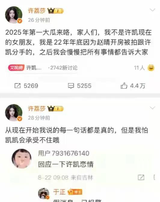 由女方聊天记录加照片视频,可以证明许荔莎在2021年与许凯谈过恋爱。 也有视频证明22年底赵情与许凯也有过同房记录,但是许荔莎怎么证明,21-22年期间两人还在谈恋爱? 这些只能证明谈过,但是没有劈腿啊。现在许荔莎一会发要被于歪抓了,一会说自己抑郁症了,很好笑吗?劈腿没有一点实质性的证据,思路也不清晰,也没时间线证明