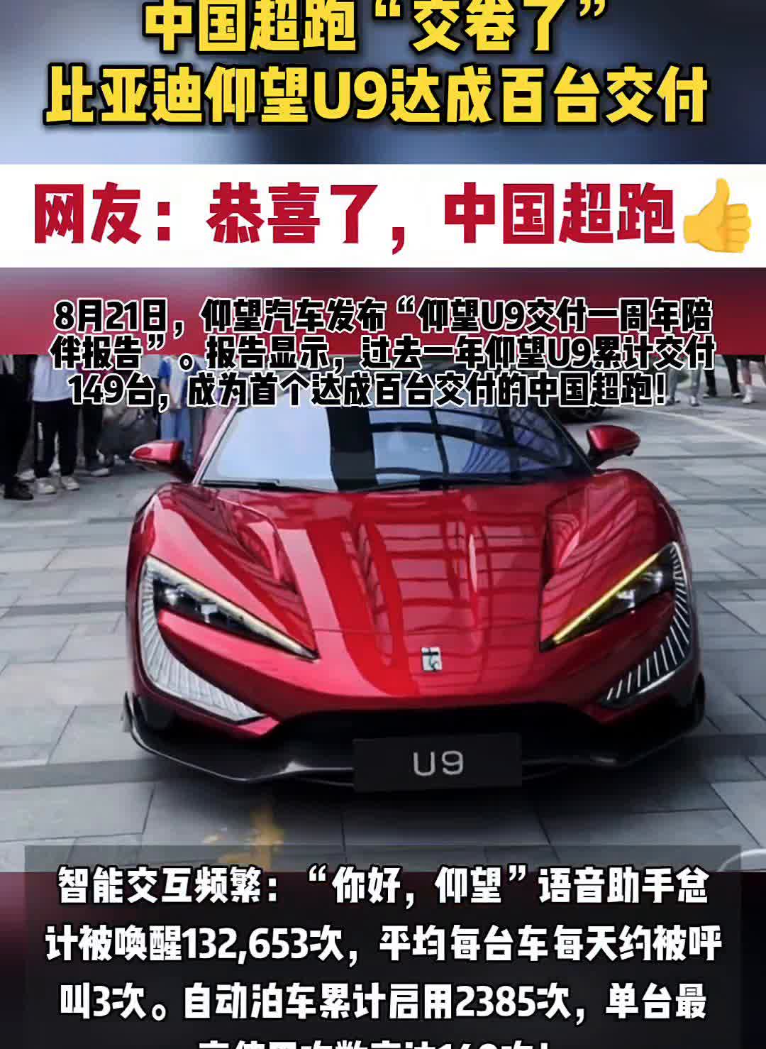 中国超跑"交卷了",比亚迪仰望U9达成百台交付。 网友:恭喜了,中国超跑。