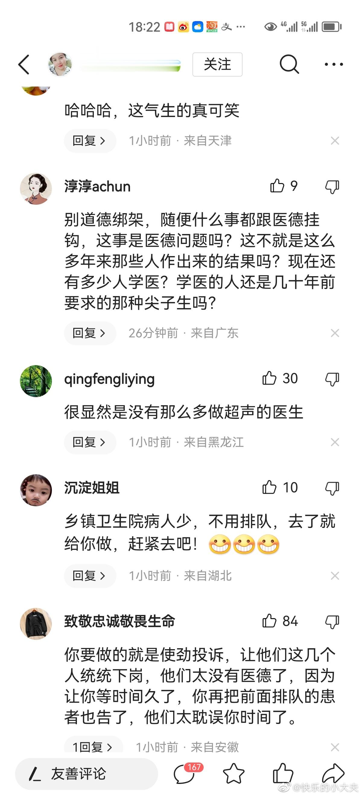 一人周末去到医院看病,做彩超等了2小时才做上,网上曝光9个诊室才开4个,之后说这是缺德,所谓医德呢!!!我一看评论放心了,看来大家都是明白人,如果你遇到这种情况会怎么想?