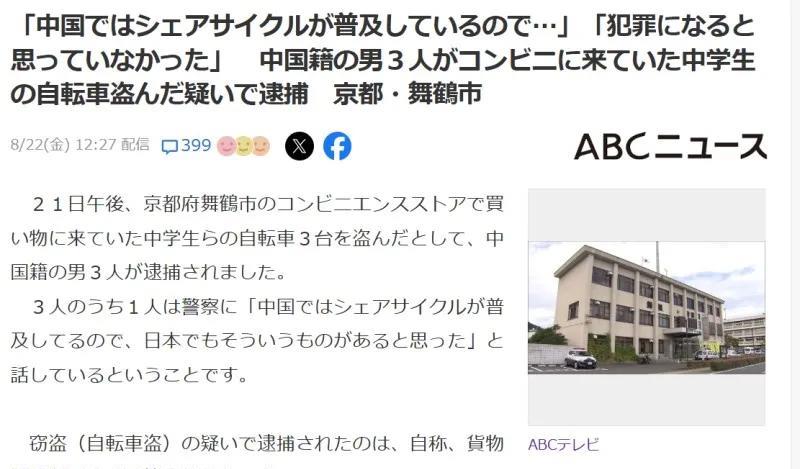 京都三名中国人骑走学生的自行车被捕 日本《ABC新闻》8月22日报道:8月21日下午2点50分左右,三名自称是船员的中国男子,在京都府舞鹤市一家便利店门口,骑走正在店内购物的三名初中生的三辆自行车而被捕。 被捕的三人自称是货船船员。 据警方称,三名男初中生将自己的自行车停在舞鹤市一家便利店门口后进店购物。其中一人的母亲联系派出所称“儿子的自行车被盗”,当警方在附近巡查时,在距离便利店2公里的街道上发现骑着自行车的三名中国人,随即逮捕了他们。