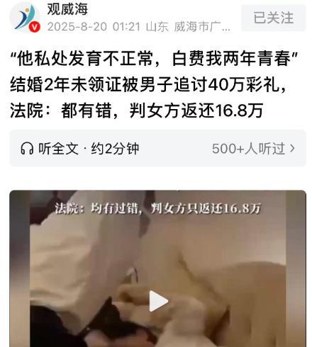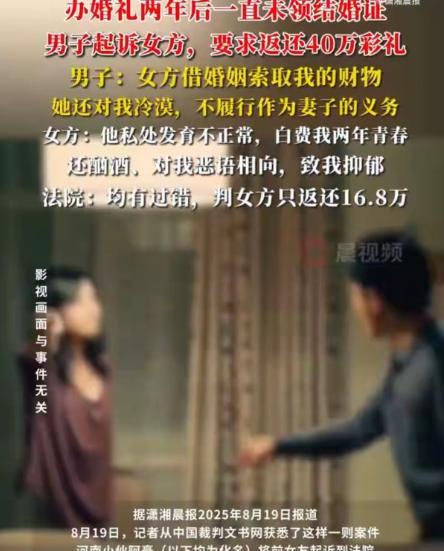 “都没办法满足我,这日子还怎么能够过下去!我要和你离婚,你实在是太让我失望了!”张女士(化名)对着丈夫李先生(化名)愤怒的说道! 原来张女士和李先生二人是通过他人介绍认识的,当时他们俩人都已经到了谈婚论嫁的年纪,当时他们在机缘巧合下认识,想着已经到了结婚的年纪,俩人并不打算慢慢的发展,也因为家里人催的特别着急! 所以二人打算结婚之后再慢慢的培养感情,紧接着他们便在家人的安排下,迅速地见面,前后认识到结婚的时间,甚至还没有一个月,俩人便迅速的走到了一起,成为夫妻! 但是已经结了婚,张女士实在是没有办法了,一开始的她觉得丈夫可以好,但是在又有一次她发现丈夫在偷偷吃药,并且吃了好久都没有好转,对此张女士已经失望透顶,一心决定为了自己的幸福,要和李先生进行离婚,并且直接收拾了自己的东西,返回到了娘家! 面对妻子要和自己离婚,李先生十分的愤怒,因为当初俩人结婚,李先生可是支付了40万包含三金的彩礼,才结婚两年的时间,就要和自己离婚,张先生要求对方返还这笔钱财,但是李女士却不愿意,因为李女士认为张先生浪费了自己两年的青春! 李先生为了要回属于自己的钱财,直接选择将张女士起诉到了法院,想要借助法律的帮助,然而经过法院法官的多方面审理,最终判决张女士按照30%的比例,返还李先生16.8万元的彩礼! 这件事很快被曝光在了网上,事件一经曝光,在网上迅速地,引起了众多网友的热议: 有的网友称道:“所以男女都要婚检,对双方都有好处,女的抵制较为强烈,为什么。现在又后悔了,想什么理都占,总会有吃亏的时候!” 那么,对于这件事,大家有什么看法?