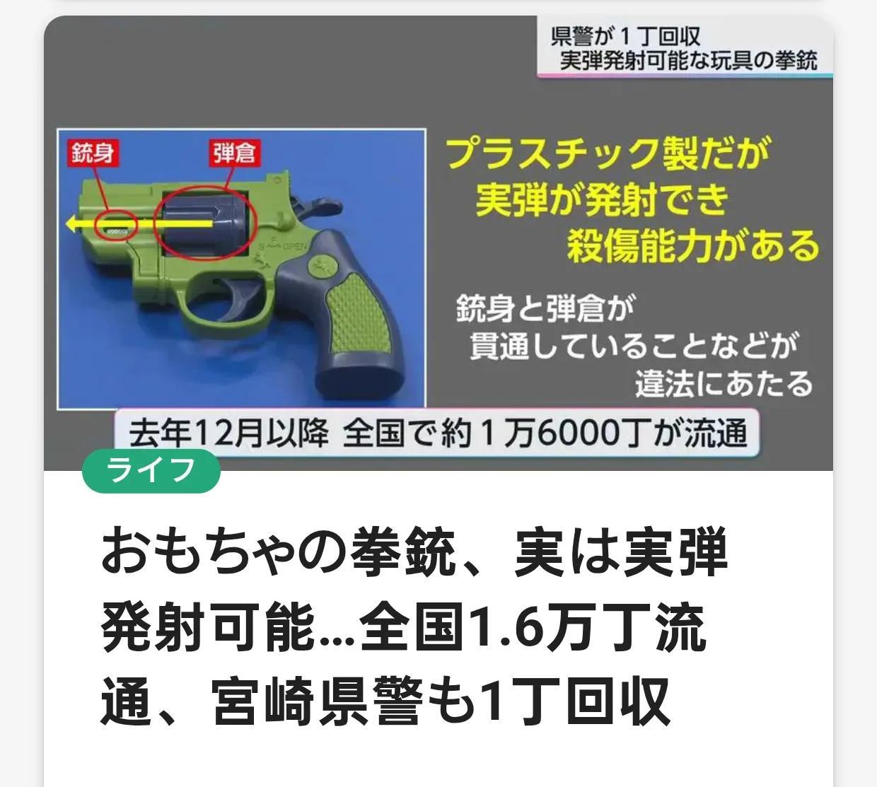 日媒:中国制塑料枪能发射实弹? 日媒《富士新闻网》8月26日报道:中国制塑料玩具枪能发射实弹,有1.6万把流入日本。 宫崎县警察本部有组织犯罪对策科徳永正彦理事官:玩具手枪“Real Gimmick Mini Revolver”是一把全长12.5厘米的玩具左轮手枪,其特点是刻有“Open”字样。 主体由塑料制成,但其结构可以发射具有杀伤力的实弹。 据说,子弹可以从内置弹匣通过枪管发射,构成了违反《枪支和刀具法》的行为。 日本全国范围内有1.6万,警方要求在持有玩具者2025 年 12 月 31 日(收集截止日期)之前向最近的警察局报告。