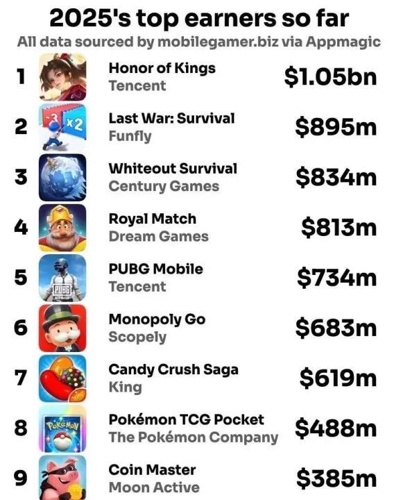 中国手游占25年上半年世界销量前三 日媒报道:MobileGamer.biz 专门从事手游的媒体公布了2025年1月~6月全球手游销量排行榜。中国占据前三名的主导地位。 来自腾讯的《绝地求生》(含中国版《和平精英》)以7.34亿美元(约合1100亿日元)排名第5,《Fight of The Golden Spatula》以2.04亿美元(约合300亿日元)排名第18位,国版《阿拉德战记手游》《地下城与勇士:起源》以2.02亿美元排名第19位。 米哈游(miHoYo),《崩坏:星穹铁道/崩壊:スターレイル》以2.69亿美元(约合400亿日元)排名第12位,《原神》以2.22亿美元(约合330亿日元)排名第17位。 在深受女性欢迎的游戏中,檸檬微趣(Micro Fun)《ゴシップハーバー:マージ&ストーリー》以2.33亿美元(约合340亿日元)排名第15位,畳紙網絡(Papergames)《爱与深空》以2.29亿美元(约合340亿日元)排名第16位。 Pokémon《ポケポケ(Pokémon TCG Pocket)》以4.88亿美元(约合720亿日元)排名第八。