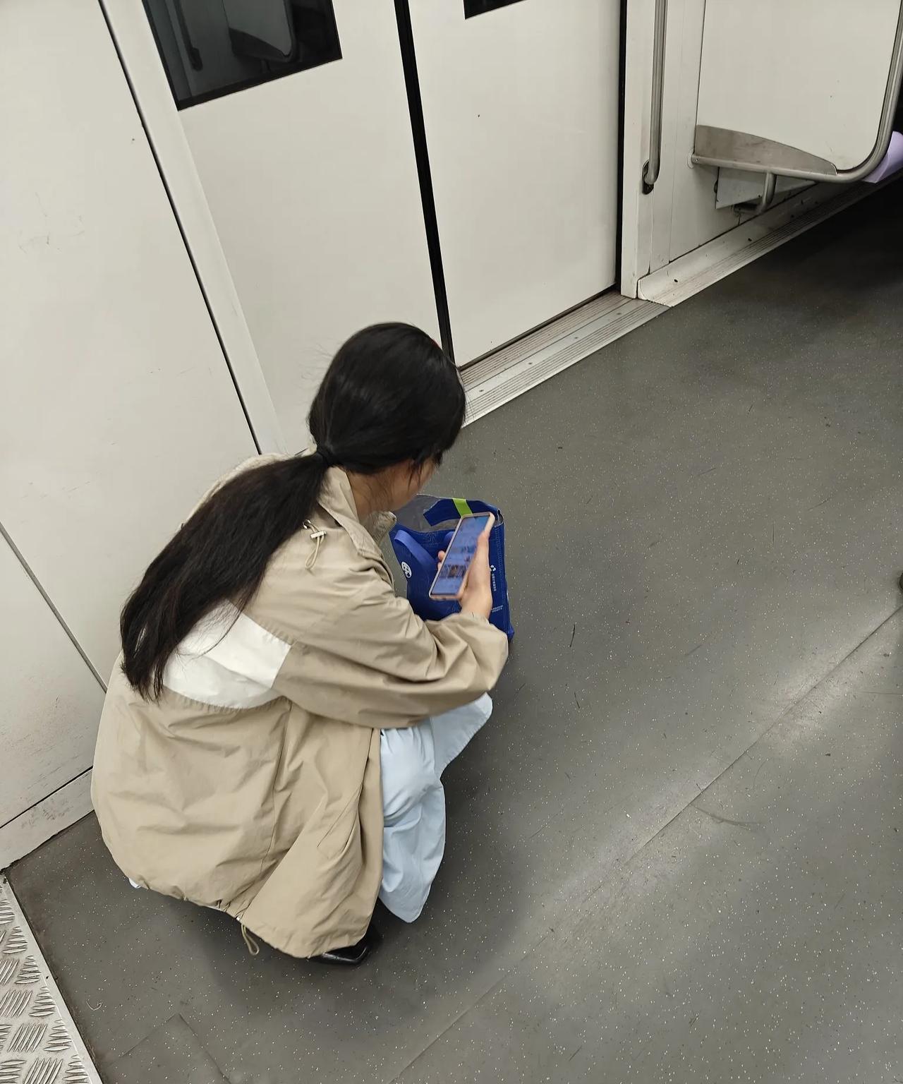 地铁内蹲坐过道手机外放 平时十号线车厢内蹲坐的人不多,偶尔有手机外放。 其实坐在过道对自己和他人都有风险,尤其上下车时都急急忙忙,容易被绊倒,自己也难以避免会受伤。 手机外放一般在年长者中比较多,年轻人车厢内手机外放的相对较少,这一位是特例。 南京东路站下车的人不少,有座位空出来了,为什么宁愿蹲在过道里呢?习惯?