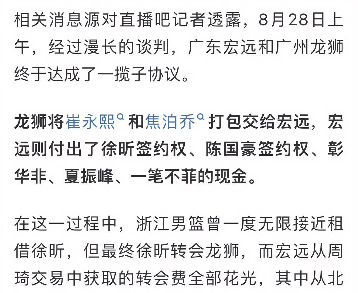 宏远与龙狮达成重磅交易! CBA近期颇为热闹,8月28日上午,宏远和龙狮达成了一项涉及多人的重磅交易。宏远把前两天耗费巨额现金交易得来的陈国豪,以及因离队风波而闹得沸沸扬扬的徐昕送到龙狮,换回崔永熙和焦泊乔。难道崔永熙新赛季要回来打球了吗?而且焦泊乔之前不是不愿来宏远吗,怎么突然又愿意了呢?宏远在这笔交易里还付出了两名年轻且颇具潜力的小将,并且拿出大量现金来促成此交易。朱总下班后又可以快乐了!#广州宏远# #广州龙狮队# #CBA那些事# #崔永熙# #陈国豪#