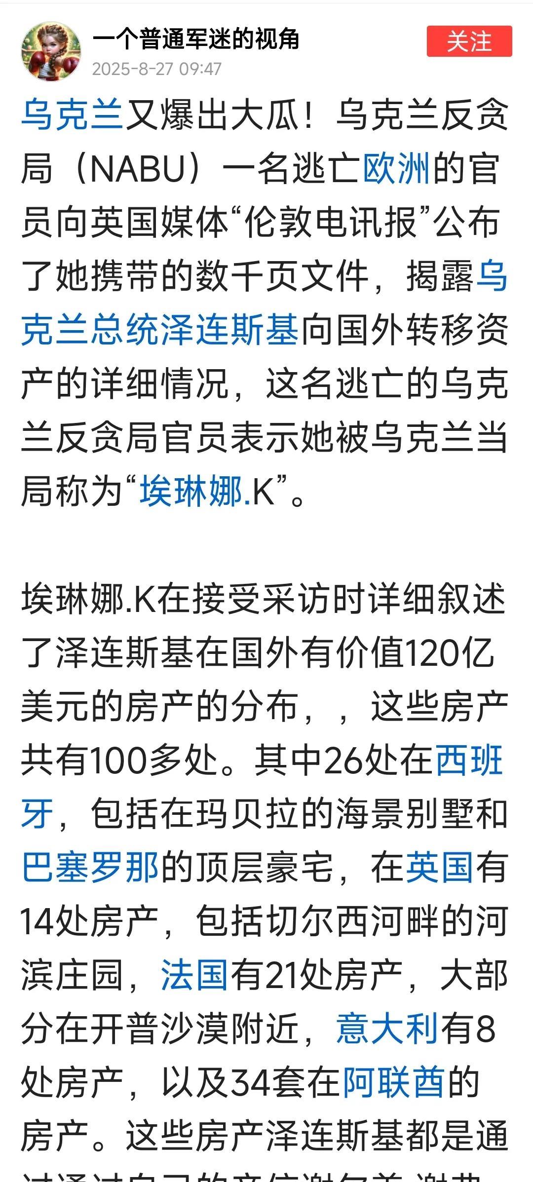 乌克兰在逃前反贪局官员爆料!根据欧盟最新宣布,欧盟已向乌克兰提供总额约2300亿欧元的援助。与此同时,在逃乌克兰前反贪局官员埃琳娜.K则是披露了泽连在国外价值120亿美元的房产的分布情况。 显然,泽连不可能只有国外房产,而基辅当局其他高官显然也不是什么清廉之士,如果挖一挖的话想来会有惊奇发生。只是可惜了德国,因为援助乌克兰导致了自己福利难以为继,不得不感叹“地主家也无余粮”!德国都如此窘态,更何况其他欧盟国家。 就是不知欧盟看到这样的一个大瓜后,有什么想法?