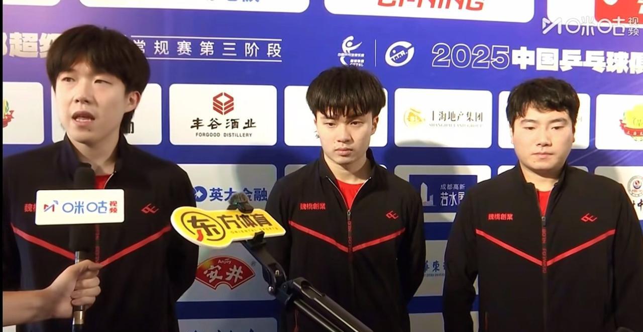 三个人采访,一个比一个声音压的低。 今天山东魏桥又第一个下班了,每次看到他们三个人在一起,就很有喜感,王楚钦在采访时,旁边两个跟按暂停了一样,俩人一动不动,一开始梁靖崑还看看看楚钦,后面也低头在看,放空自己。 今天还是林昀儒/梁靖崑打第一盘男双,就是在第二局的时候林昀儒有个球回到大胖头上了,看着都疼,那个球后,连丢了四分,后面又赢回来了。山东魏桥是3-0战胜上海地产队,早早的下班了。 每次他们三个采访,都是先问王楚钦,楚钦说的比较多。今天第二个问的林昀儒,林昀儒说这边是高原,自己有点不适应,也在一点点调整吧,到了梁靖崑这里,他声音比小林还低,说两个人配合的还不错,场上沟通也好。 今天是乒超第三阶段的首个比赛日,一日两赛,回去好好吃饭,好好休息,晚上还有比赛,晚上应该会换其他人上,要不然一天两场太累了。