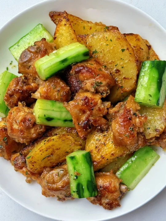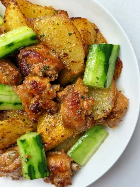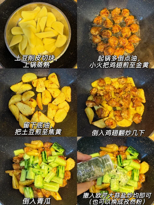 4️⃣留下底油,倒入土豆半煎炸至焦黄,倒入鸡翅,再倒入青瓜,撒入适量欧芹大蒜盐或孜然粉,翻炒均匀即可